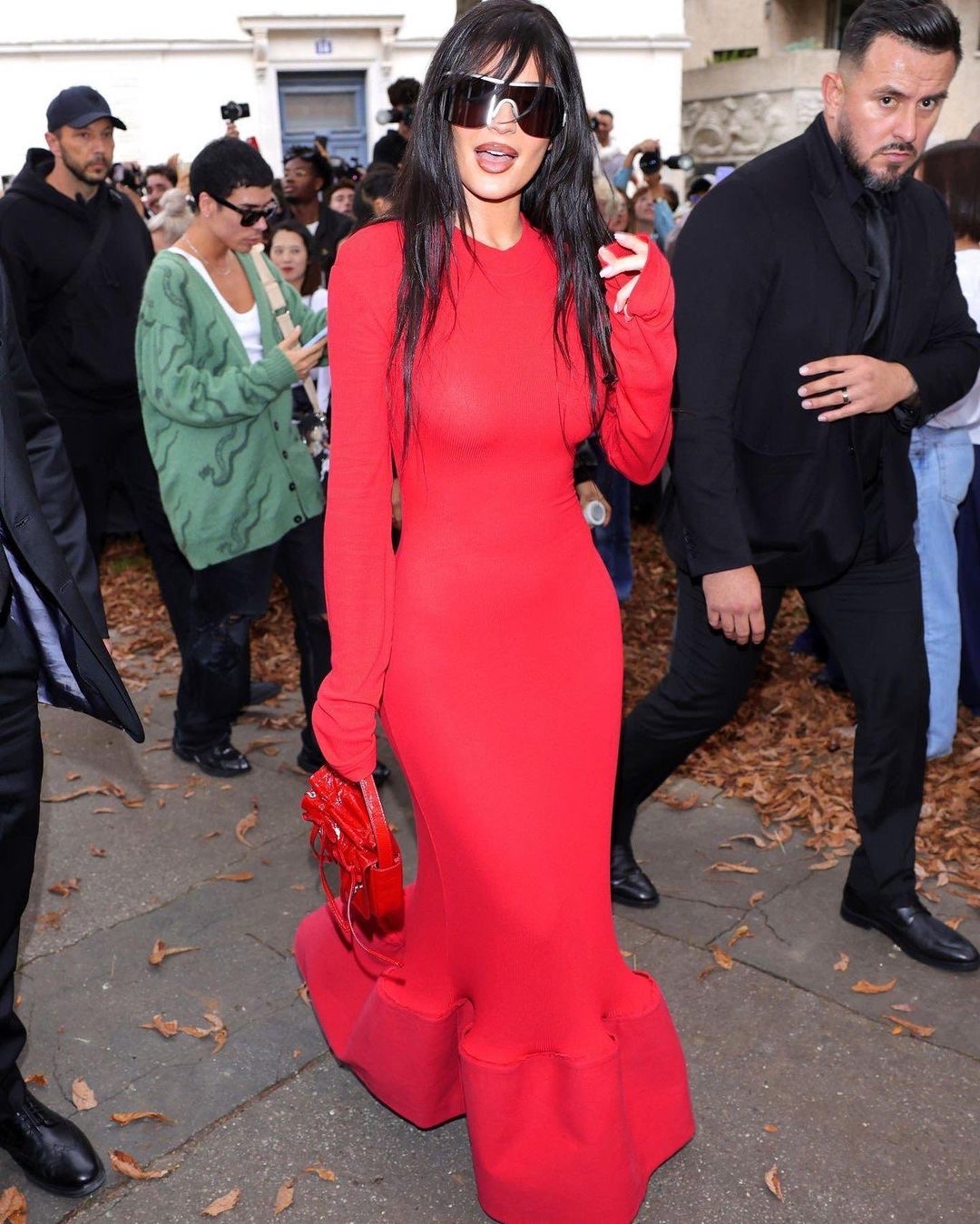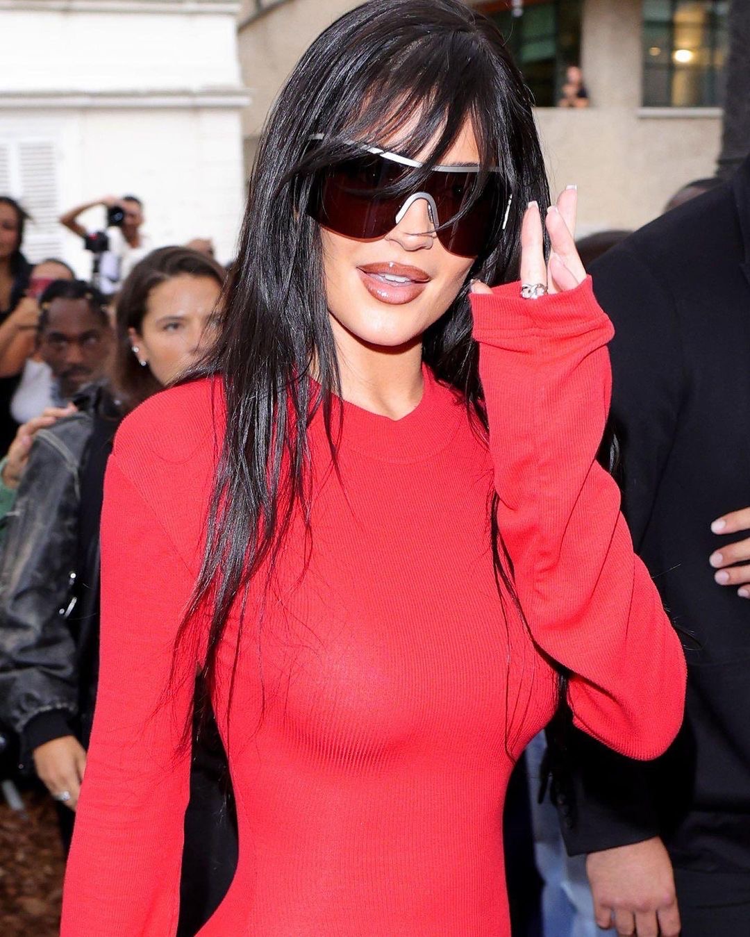 Also taking part in the red trend was business mogul Kylie Jenner who could have been easily been mistaken for her older sister Kim Kardashian in an all red Acne Studio dress at Paris Fashion week on Wednesday.