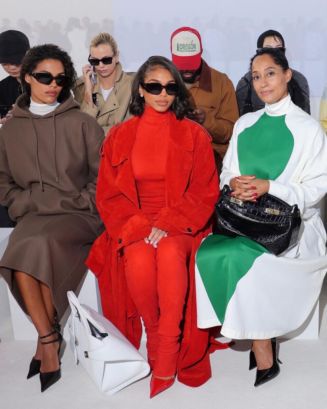 Sitting front row next to Tracee Ellis Ross with her poker face on, Harvey looked on trend with a red turtleneck top that she layered with a red suede trench jacket. Not to mention her red pants that went below her ankles for an 80’s feel and complimented her red patent leather pumps.