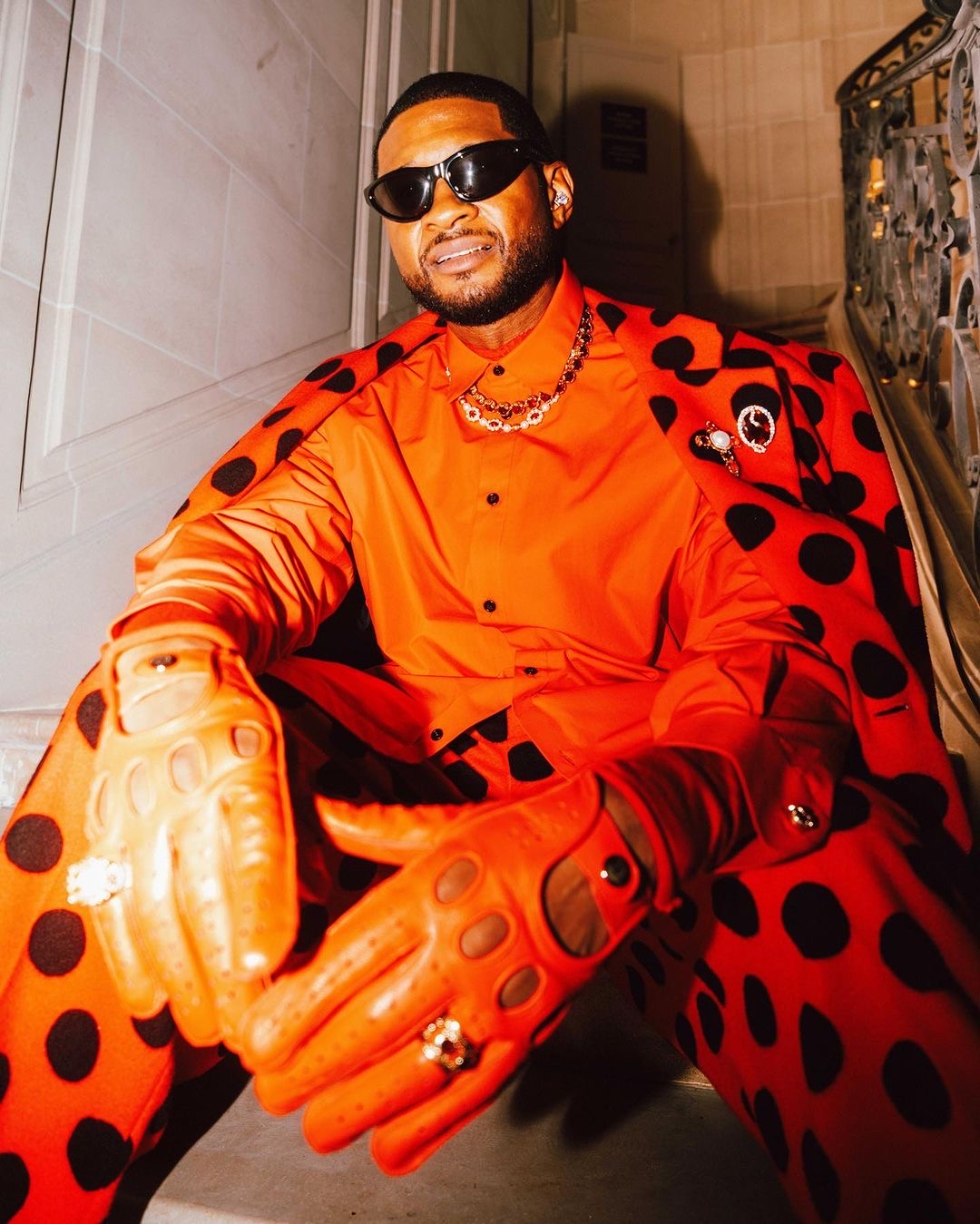 Opting to make a bold statement and rubbing shoulders with the infamous Anna Wintour, Usher wore a red polka-dot Marni suit that was adorned with embellished pins and accessorized with red leather gloves.