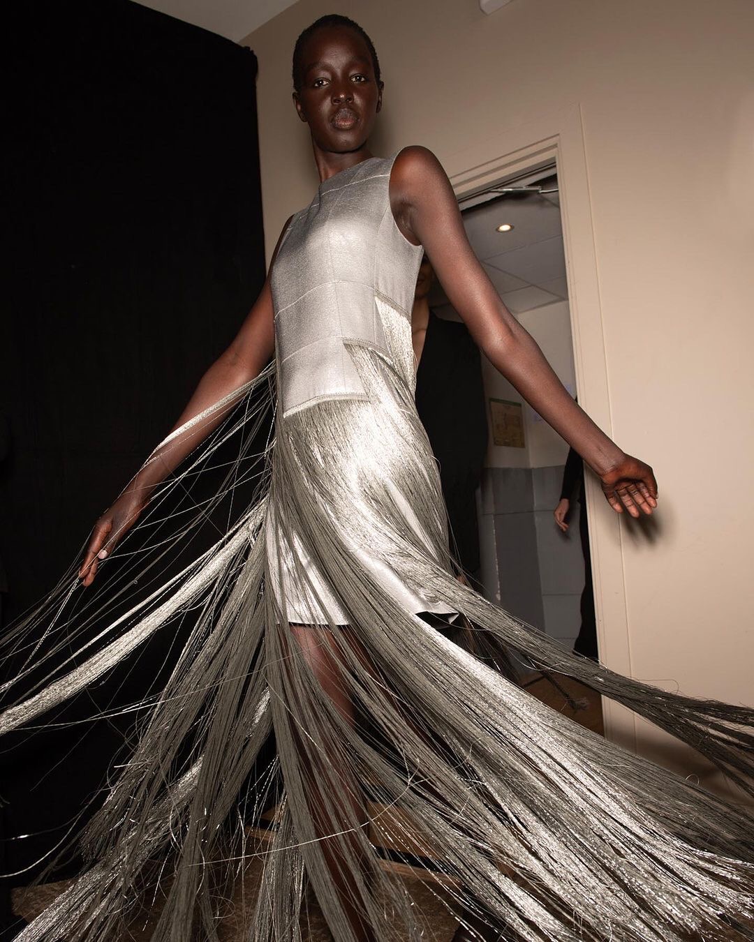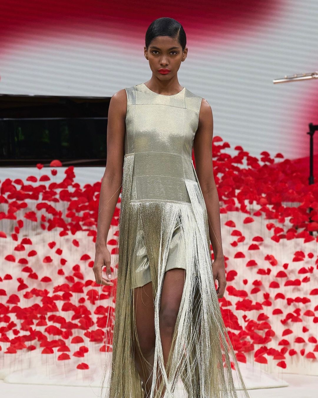Turning heads left and right with models sashaying in fringe dresses, skirts and even tank-tops, Akris added additional dimension with their various use of silk fringe.