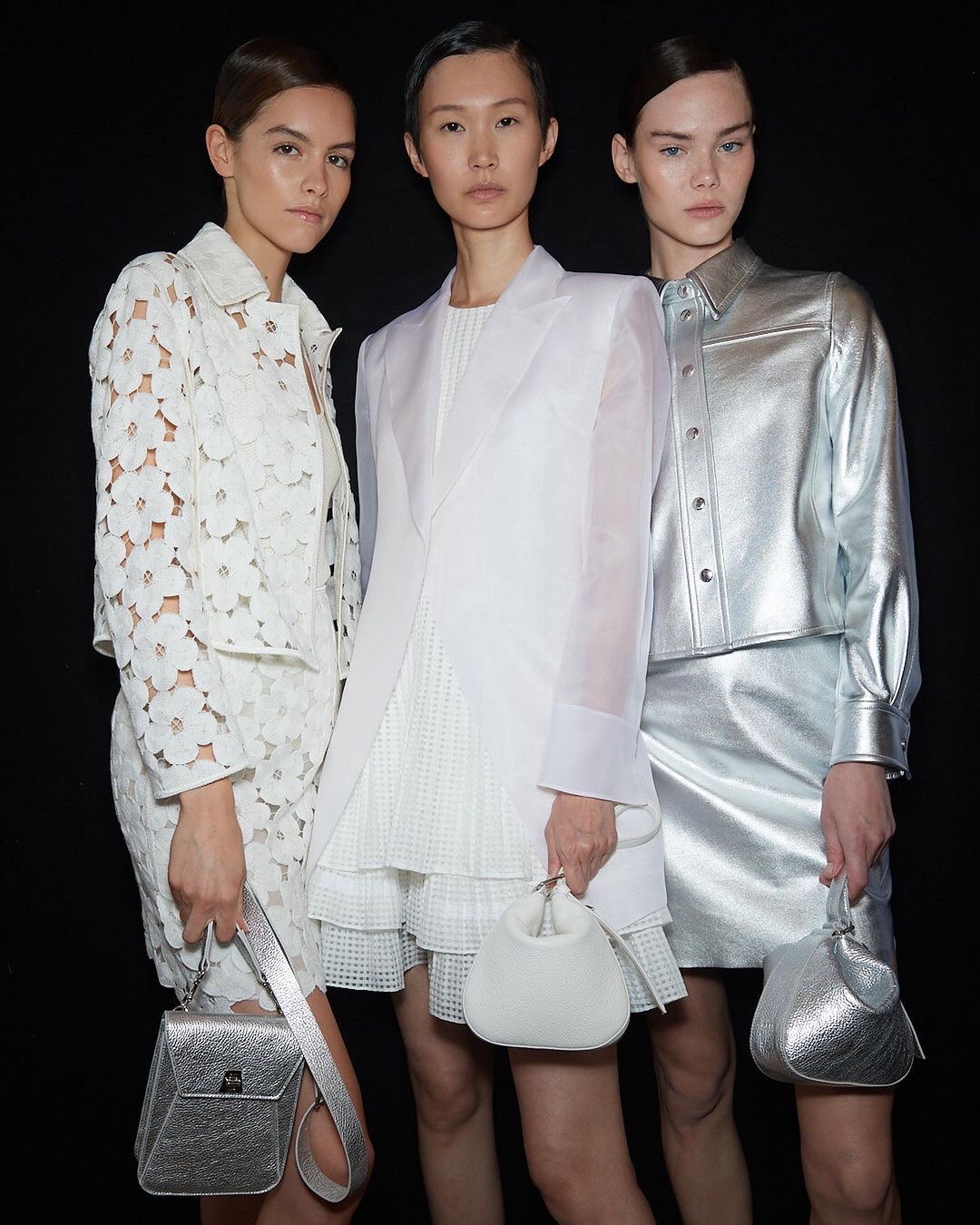 In addition to vibrant colors, we saw models in all white monochromatic ensembles including white embroidered jacket and skirt combos, and a white organza blazers. Metallics also made a peak-a-boo debut on the runway as Spring 2024 will be all about the silver futuristic hue.