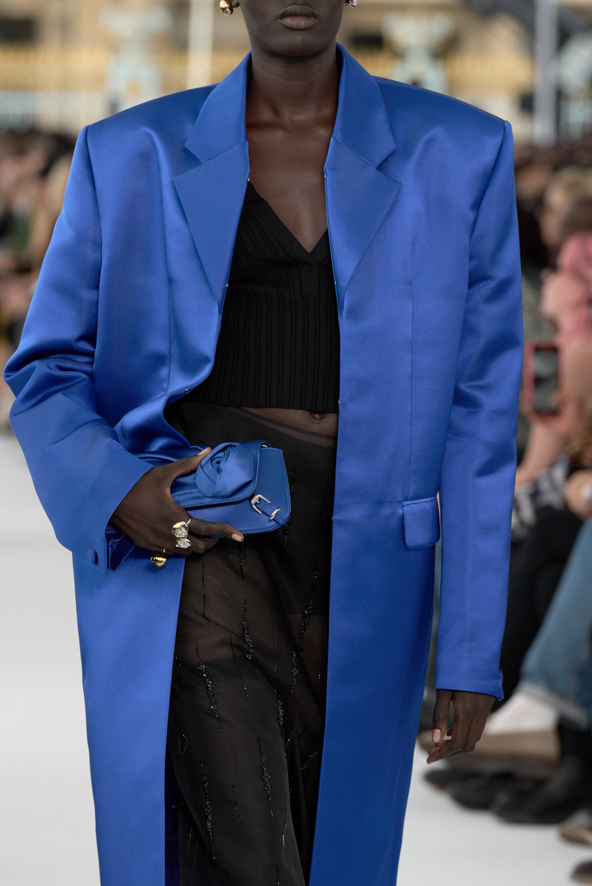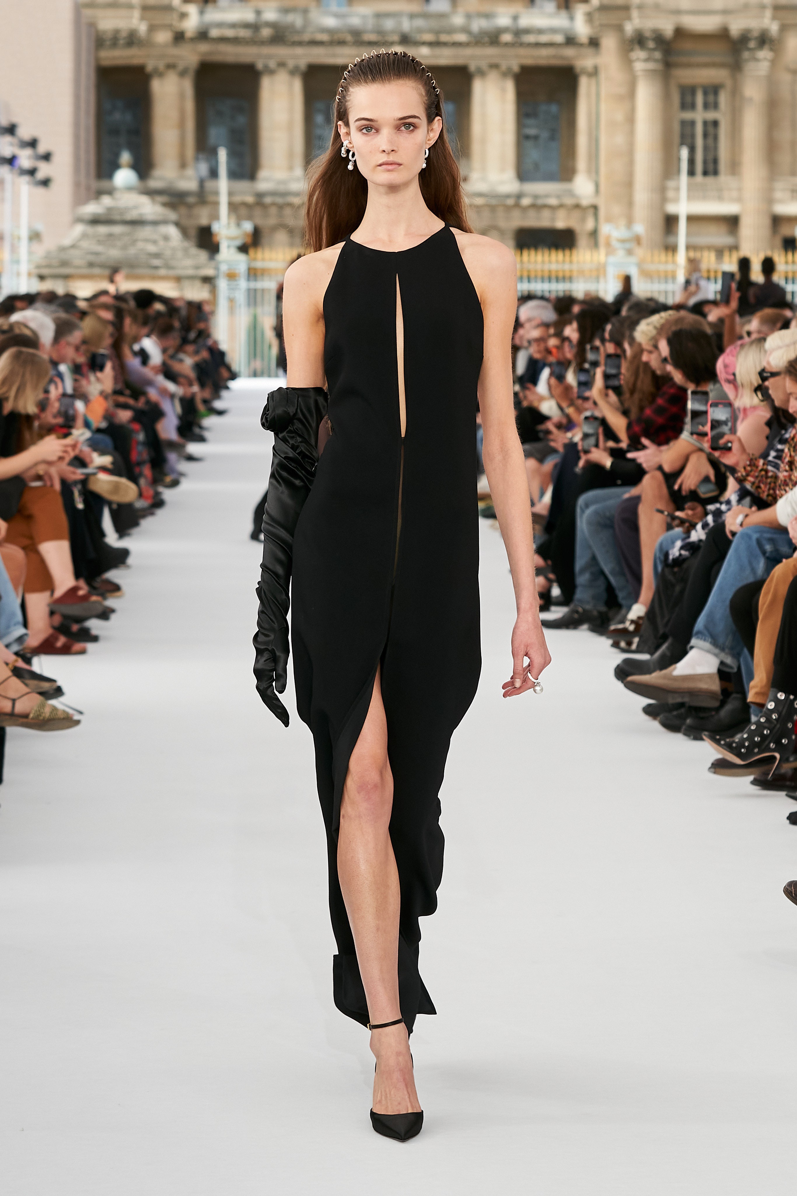 High jewelry makes a strong appearance too. A nod to the brand’s recent collab with Tiffany & Co. came down the runway in Audrey Hepburn references (the unwavering jewelry house’s muse) with bow-adorned opera gloves and a variation of Hepburn’s iconic LBD by Givenchy. The Spring 2024 variant features a slim keyhole cut-out and frontal skirt slit.