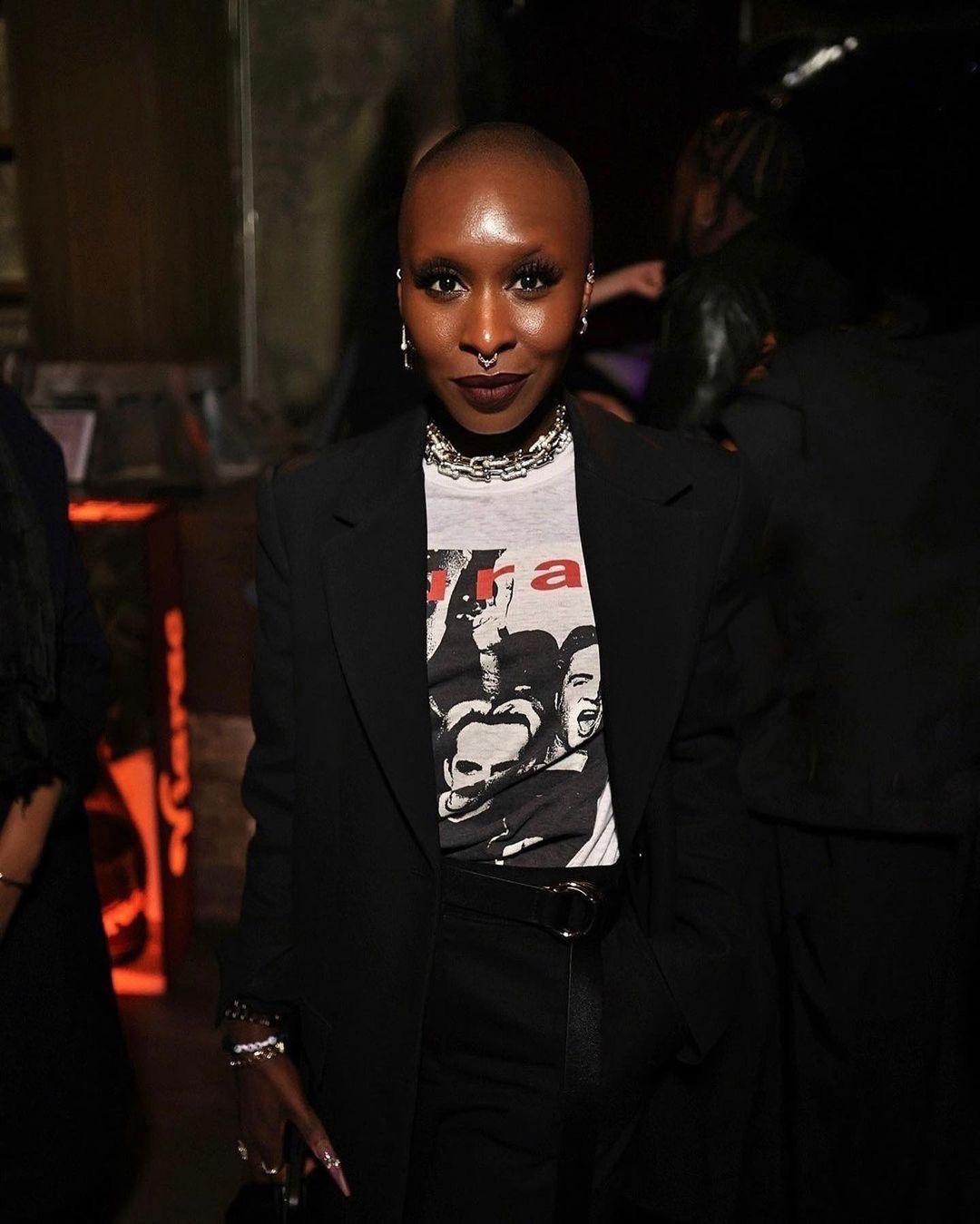 Actress and singer, Cynthia Erivo looked so chic in her black blazer and graphic tee combo that she layered with a chunky silver necklace. Her bold maroon lip was complimentary to her smokey eye shadow.
