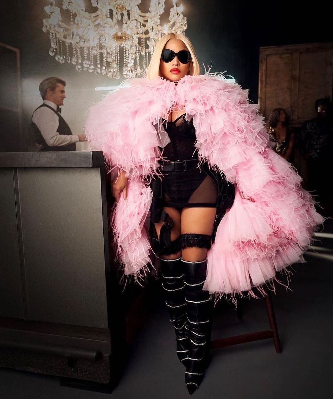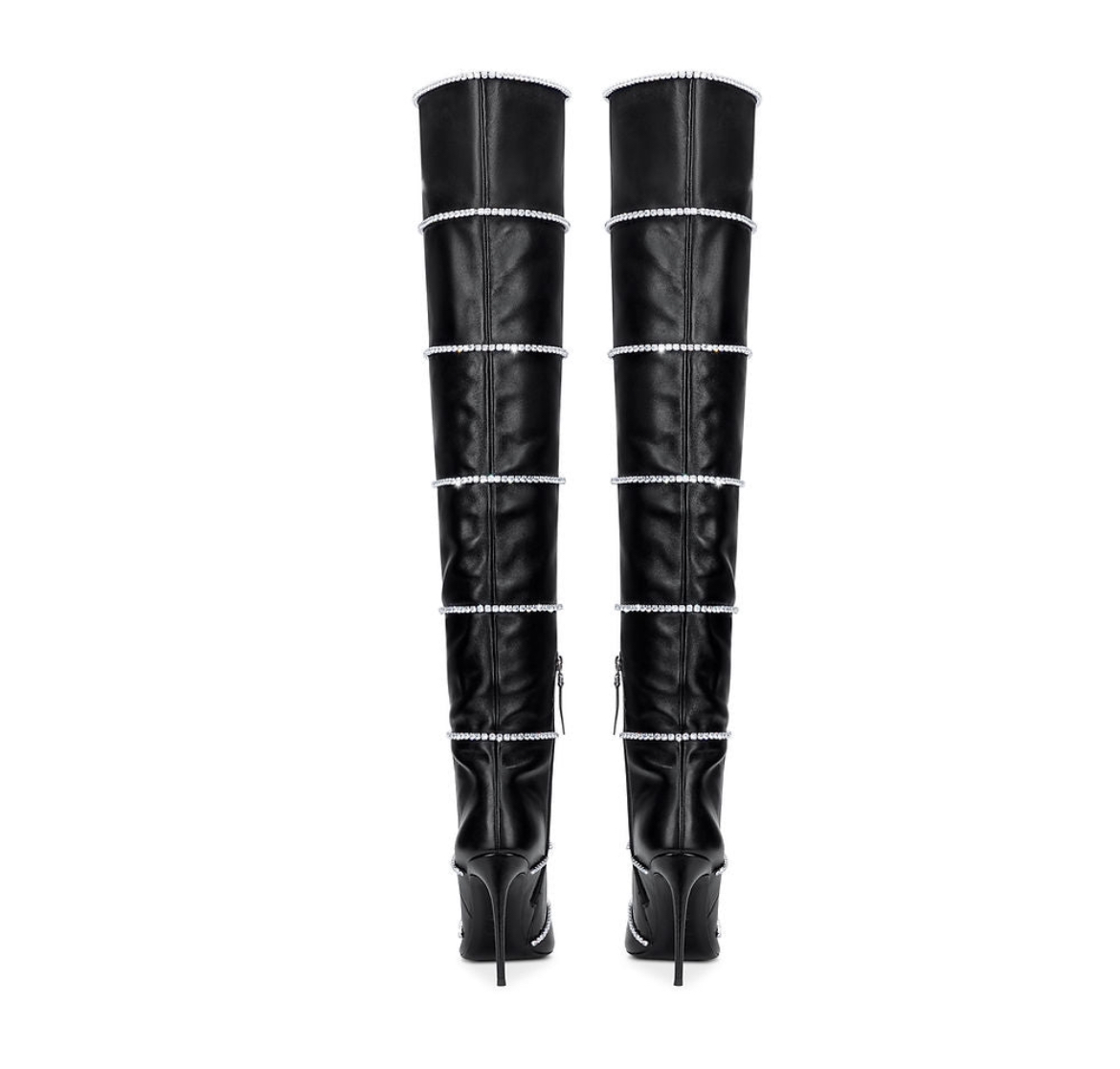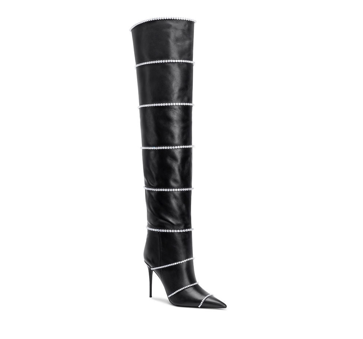 The over the knee Voyette Lee Chie boots that Minaj wore are crafted from buttery cow leather and are adorned with zirconia crystals that are hand stitched throughout the boot.