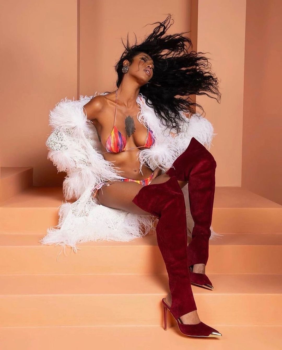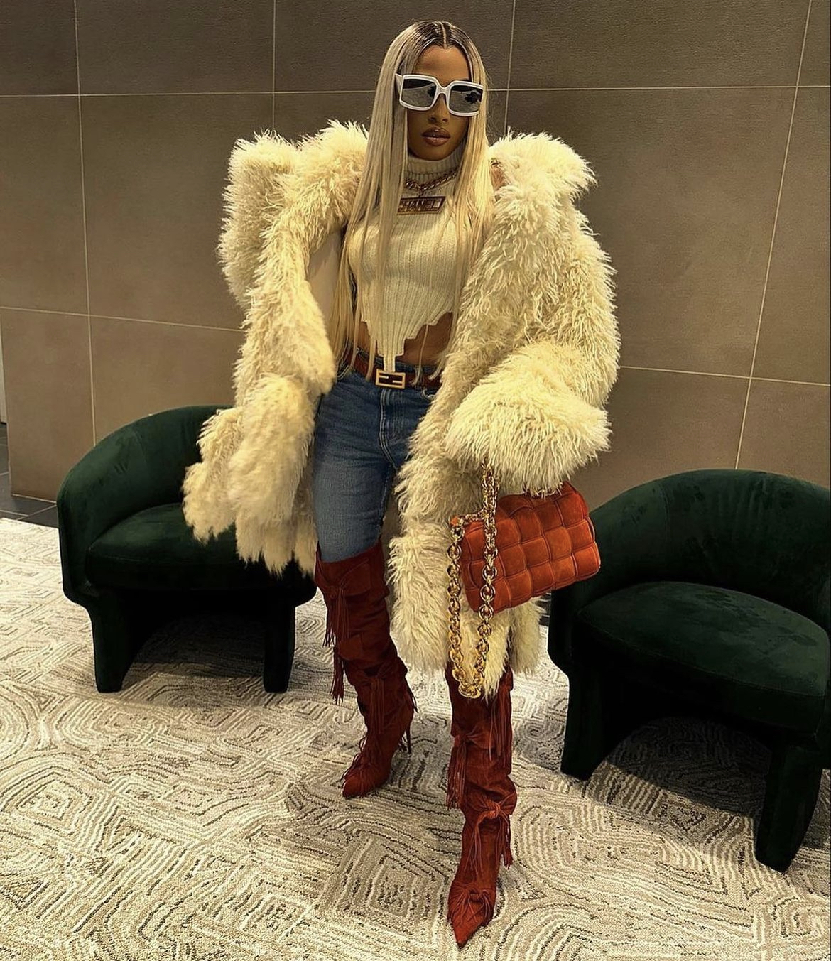 Fashion Influencer Alonzo Arnold, slayed the scene in Voyette Lee Jayla Fringe boots in rust from BeautyLifeFun shop and gave fashion inspiration with their oversized teddy coat and cut out crop top.