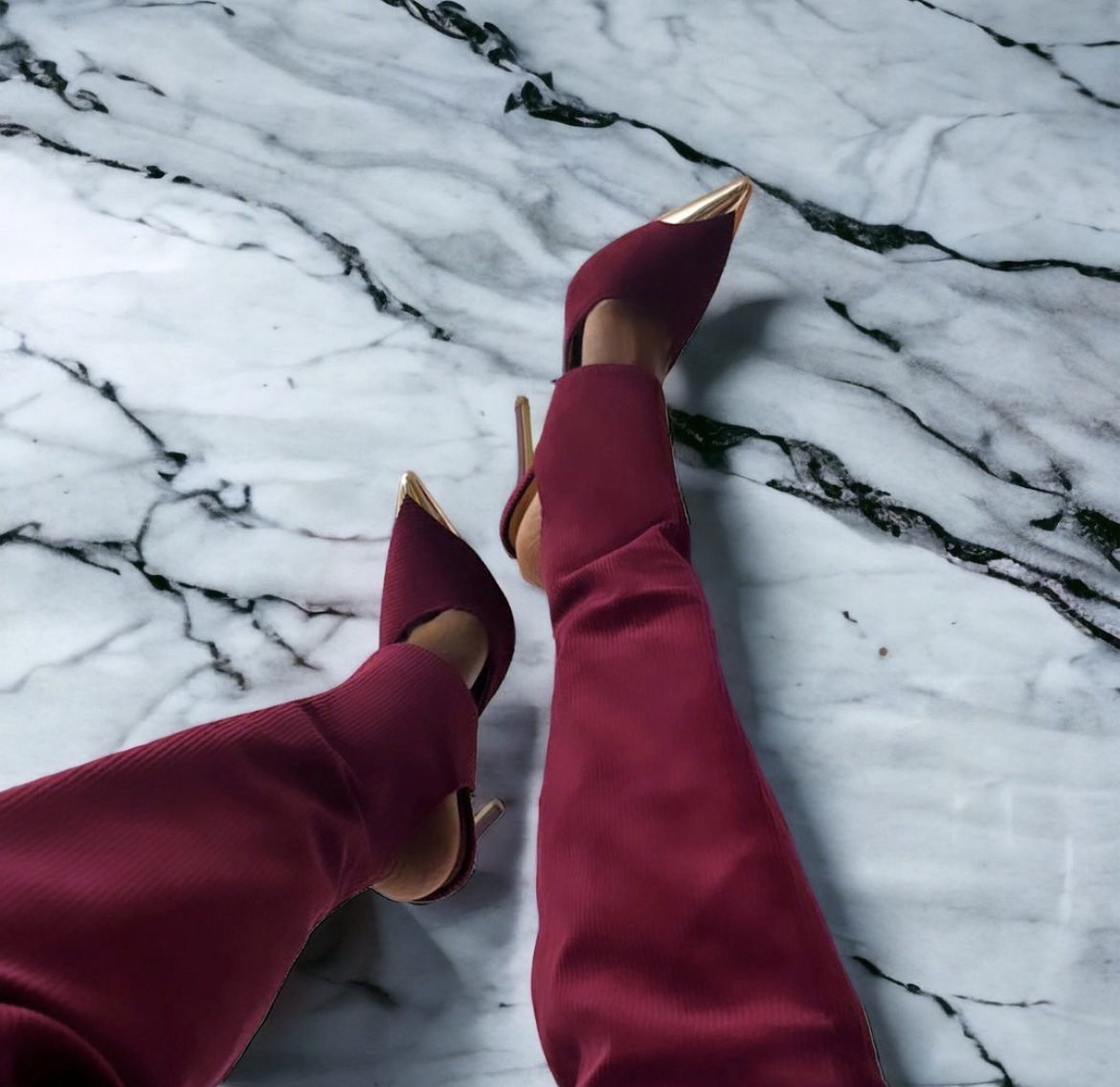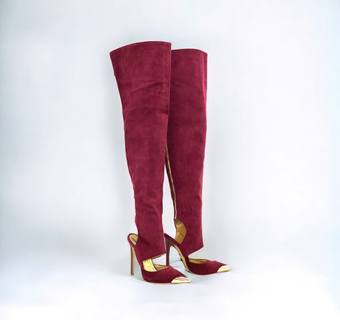 For one of White’s looks, she wore burgundy and gold thigh high boots by SYBG that had cut outs and gold hardware at the tip of the stiletto. Considering that the fabric is corduroy, you can wear these boots year round for added sophistication.