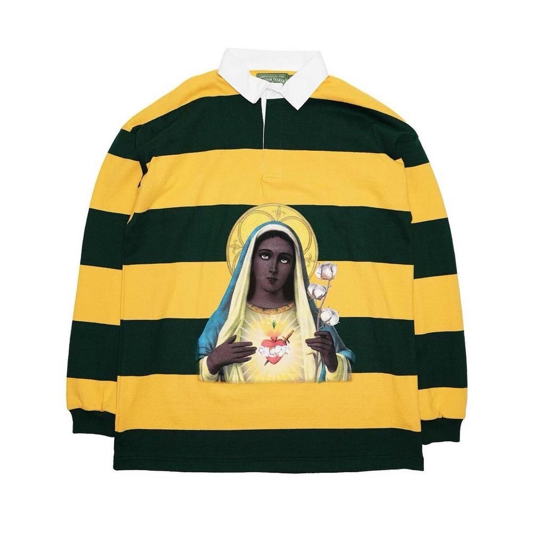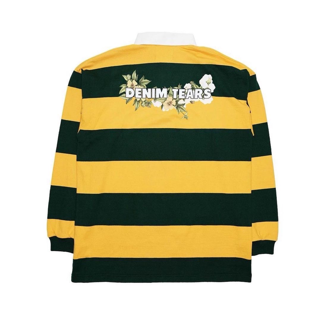 To celebrate his birthday month, the Houston Native posed in front of a white sprinkled cake wearing a $450 green and yellow Denim Tears Madonna Rugby shirt, that had had the brand’s floral logo featured on the back.