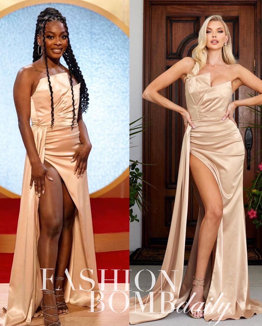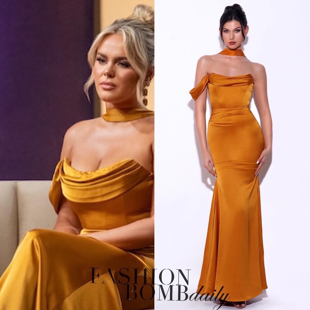Lydia’s archnemesis, Aaliyah looked gorgeous in a gold off-the-shoulder Moda Glam Boutique dress, known as the “Monroe Gown” that was elegantly draped and looked luxurious with her sparkly lace up sandals.