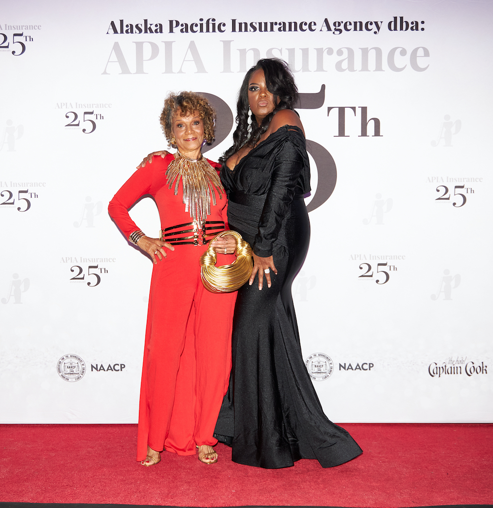 Fashion Bomb CEO Claire Sulmers hopped on a plane to the Last Frontier, and hosted the red carpet in a red strapless Valdrin Sahiti gown with red gloves, that she layered with a white fox fur bolero from the Fur and Leather Centre to support APIA successfully being in business for a quarter of a century .