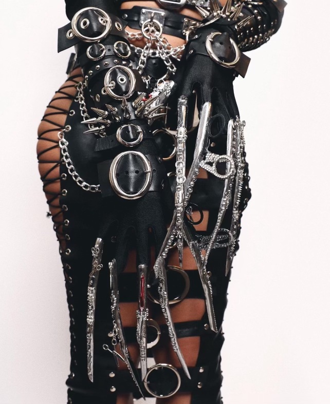 Created by manicurist, Temeka Jackson, Saweetie’s extra long nails were curated to look like knives and scissors. For her makeup glam, artist Kenya Alexis painted the rapper in the palest shade of white, mimicking Edward’s skin from the film. In addition to the exact black makeup, Alexis completed her make-up with sculpted cheeks and dark shadows for dramatized contour.
