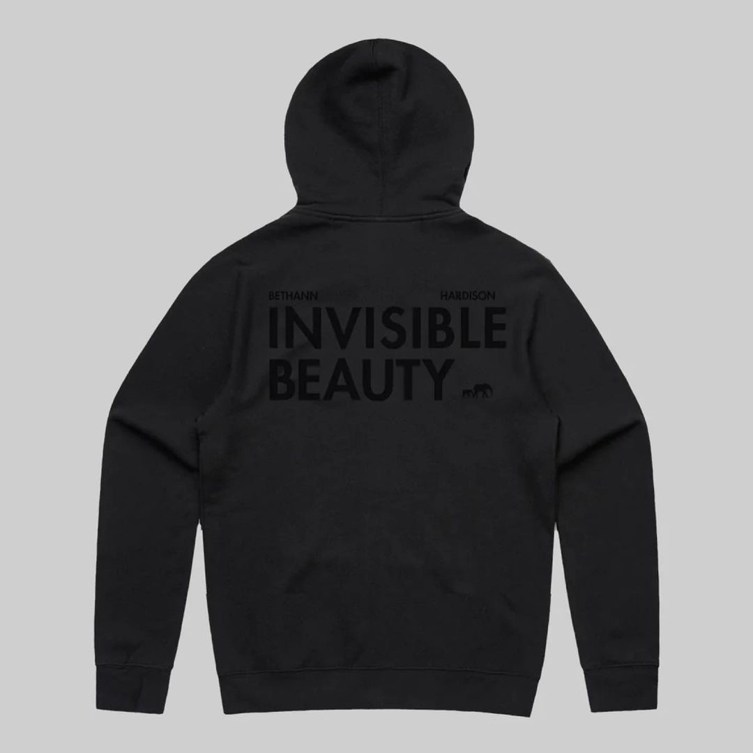 The double fleece lined hood and body that features a “B” on the front, and ‘Invisible Beauty’ on the back, has sewn eyelets and seams that are finished with a reverse cover stick for a premium look.