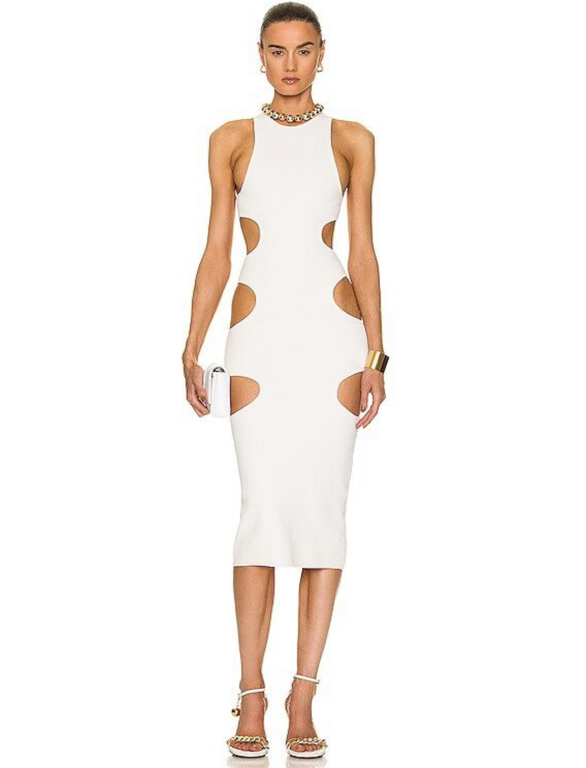 The $790 Dundas midi dress that Kenya Moore sported, hugged her curves to a tee and had circular cut-outs down the sides and back with lace-up detailing. She opted for clear embellished stilettos, and kept her jewelry to a minimum with a gold necklace.