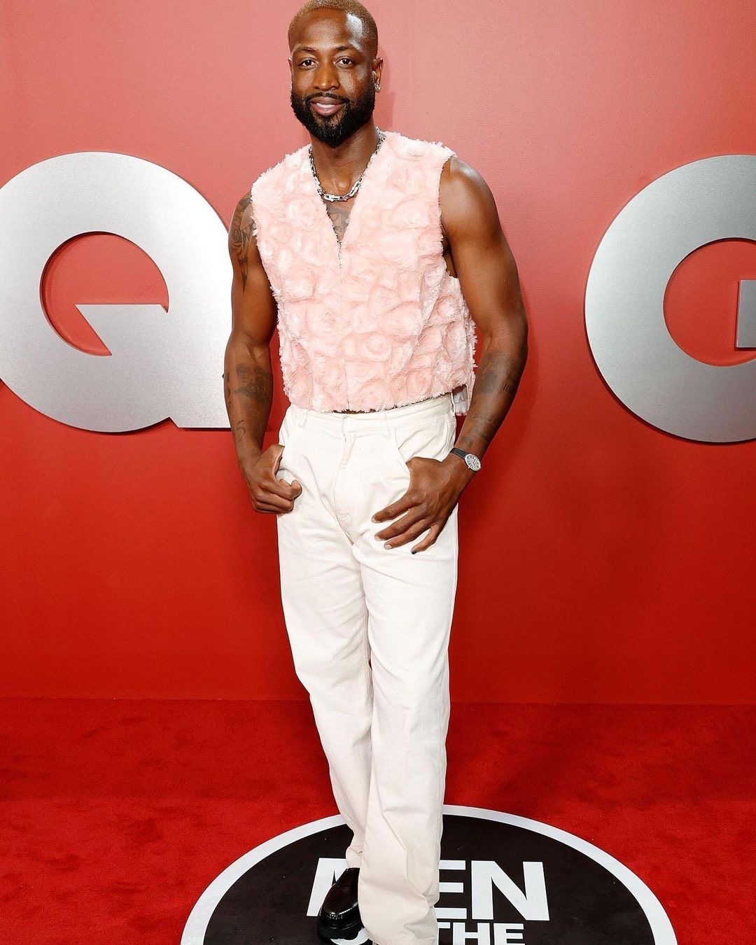As we all know, retired NBA Star Dwayne Wade, 41, never misses and the Chi town native kept things light and airy in a blush pink textured vest that he paired with white straight denim jeans and black loafers. His blonde roots added contrast to his black beard and we couldn’t keep our eyes of his muscular built.