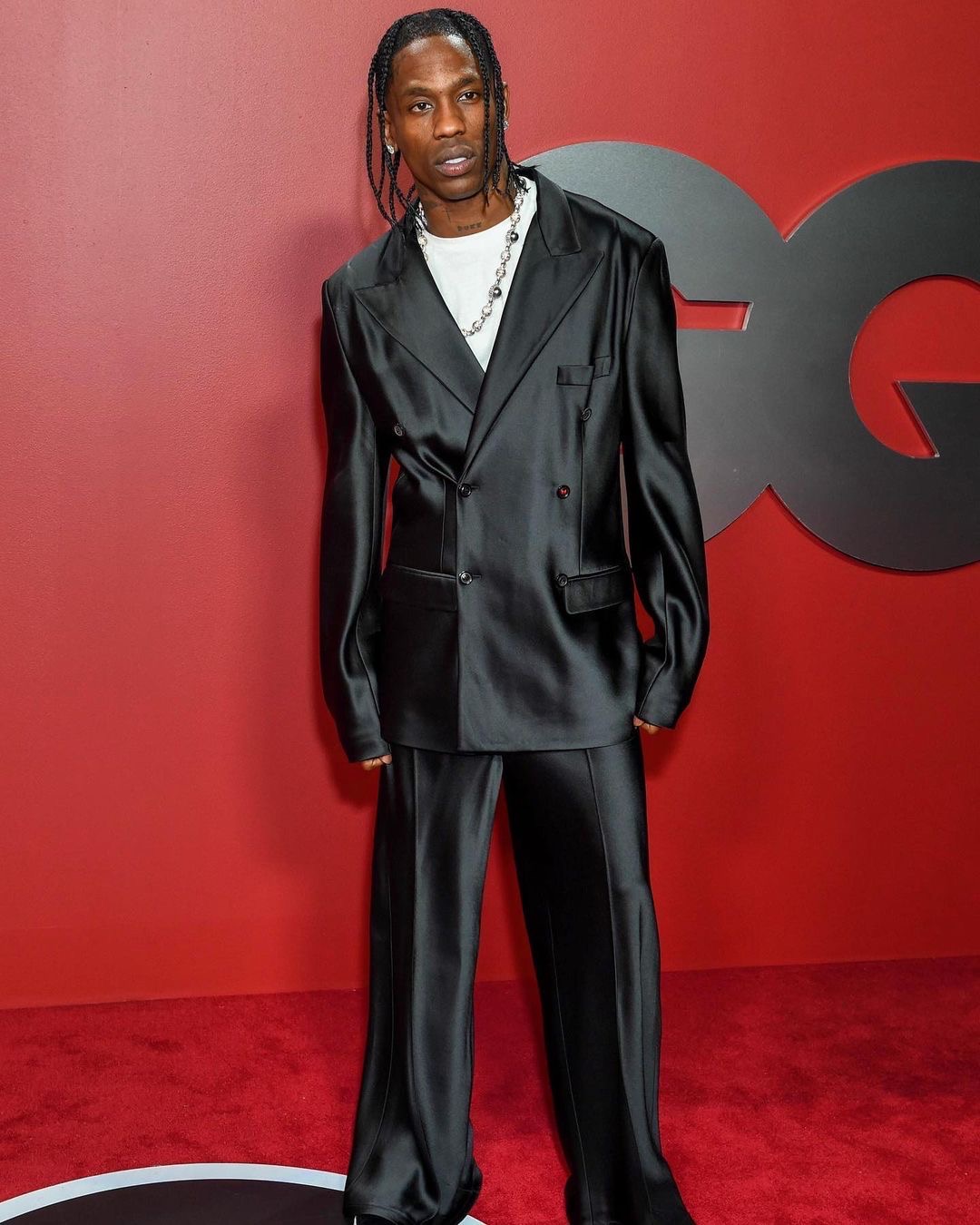 Keeping things suited and booted was multi-platinum artist Travis Scott who wore a black satin Maison Margiela double breasted suit that he paired with a white crew neck shirt, along with a statement silver necklace.