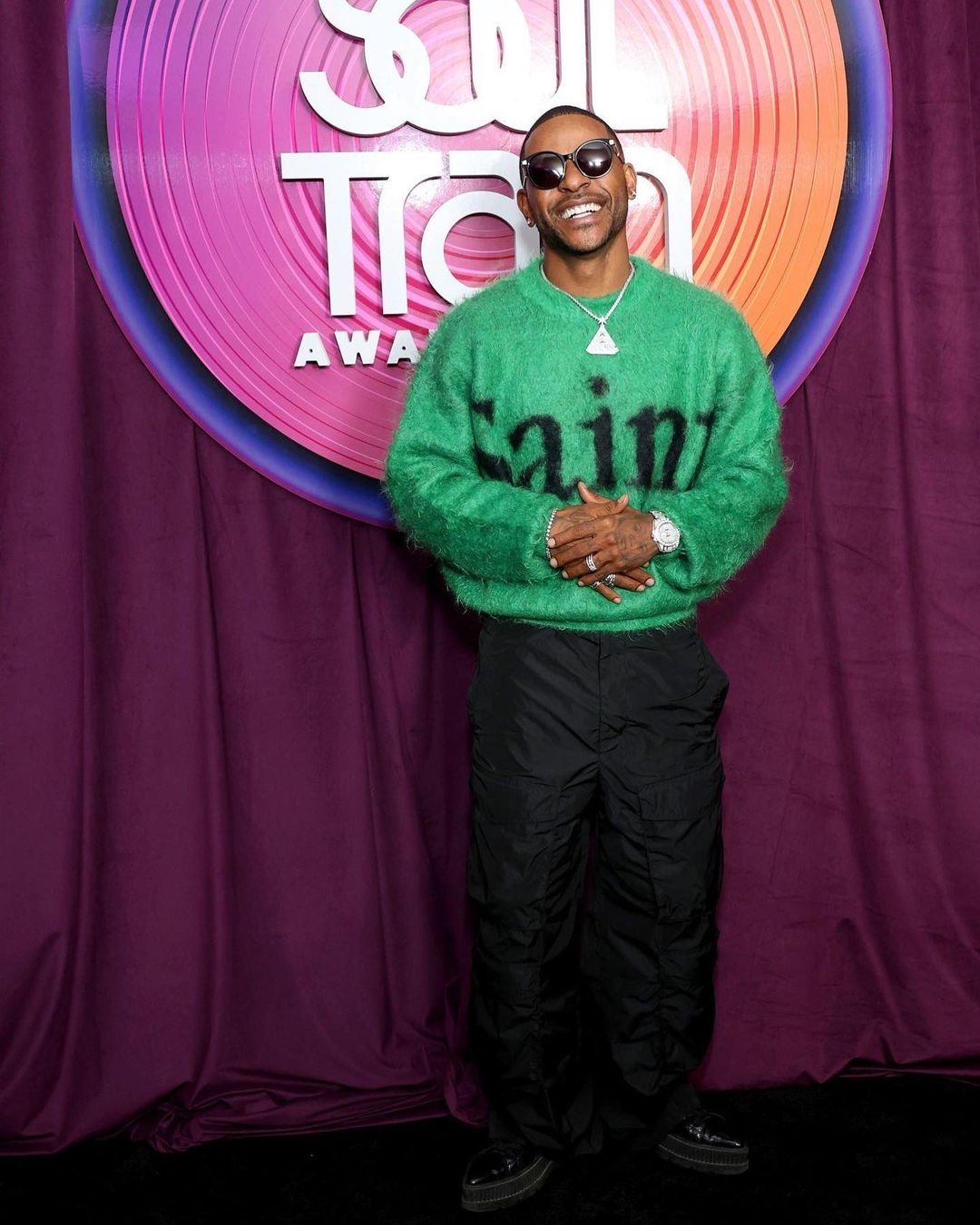 Representing for the stylish men on the red carpet, R&B singer, Eric Bellinger posed in a fall green $1,120 Saint Mxxxxxx eyelash sweater that had the word “Saint”written in bold black lettering.