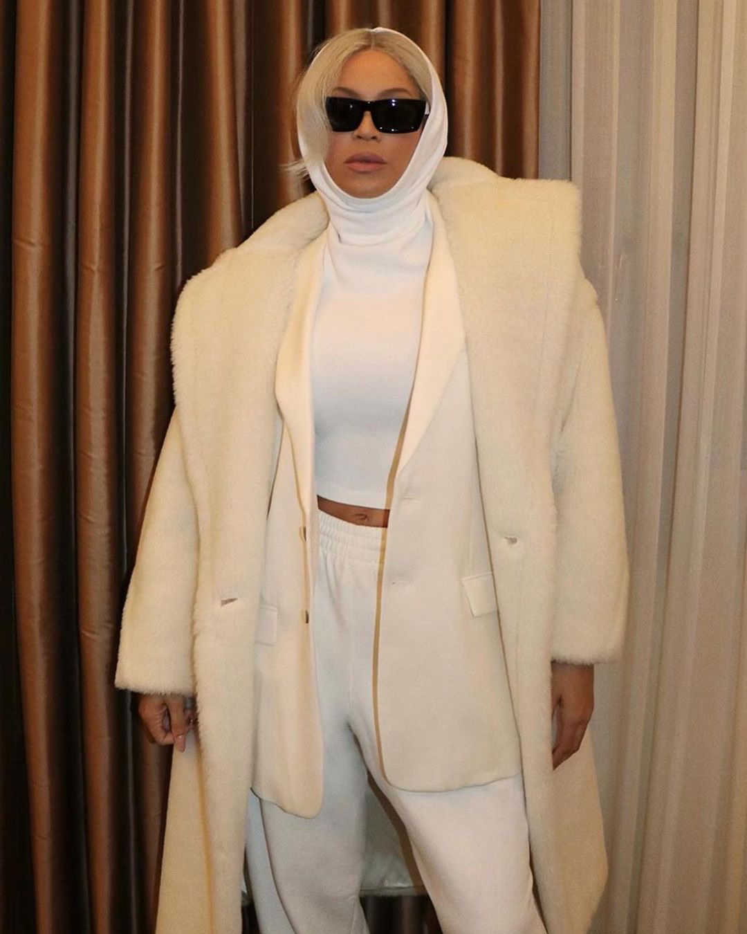 Dripped in an all white monochromatic look, styled by Shiona Turini, Bey looked mysterious and fashion forward in a white cropped hooded Alaïa top that she sported with dark black frames, and layered with an oversized blazer, and white sweatpants.