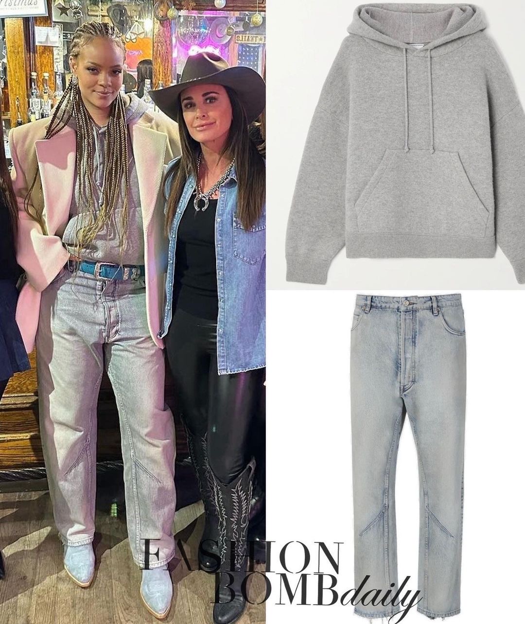 Layering her Saint Laurent blazer over a $3,500 grey cashmere-blend Bottega Veneta hoodie, RiRi oped for a full westernized look with light washed Balenciaga distressed jeans that had frayed edges.