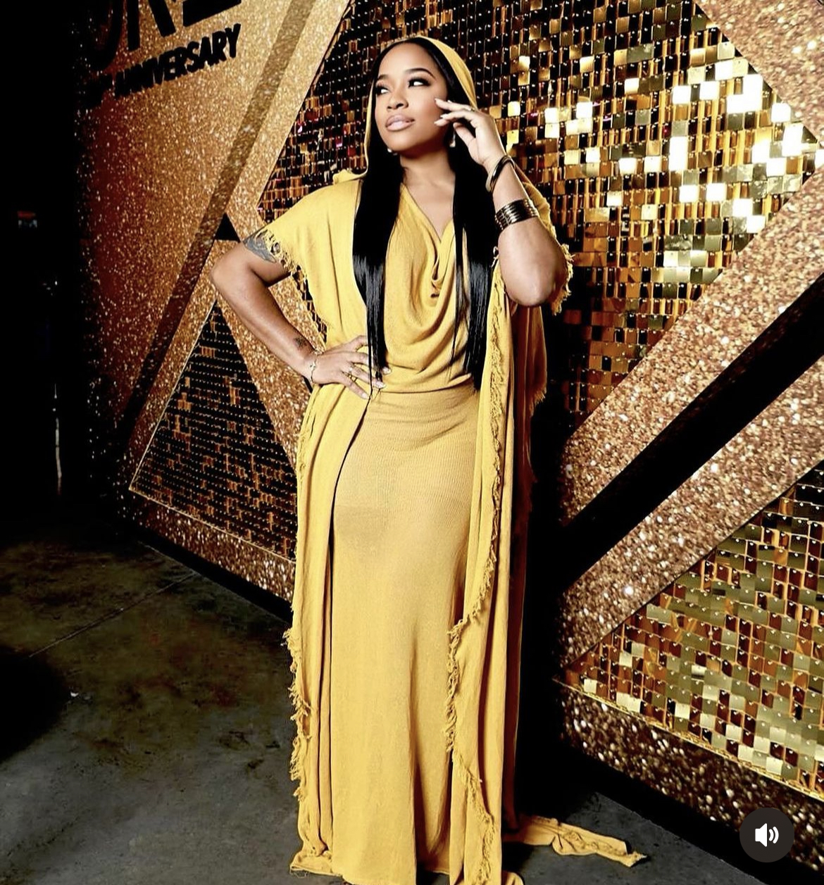 Toya Johnson gave us goddess vibes in a yellow Bronx and Banco gown that covered her head and was characterized with frayed edges and a long train.