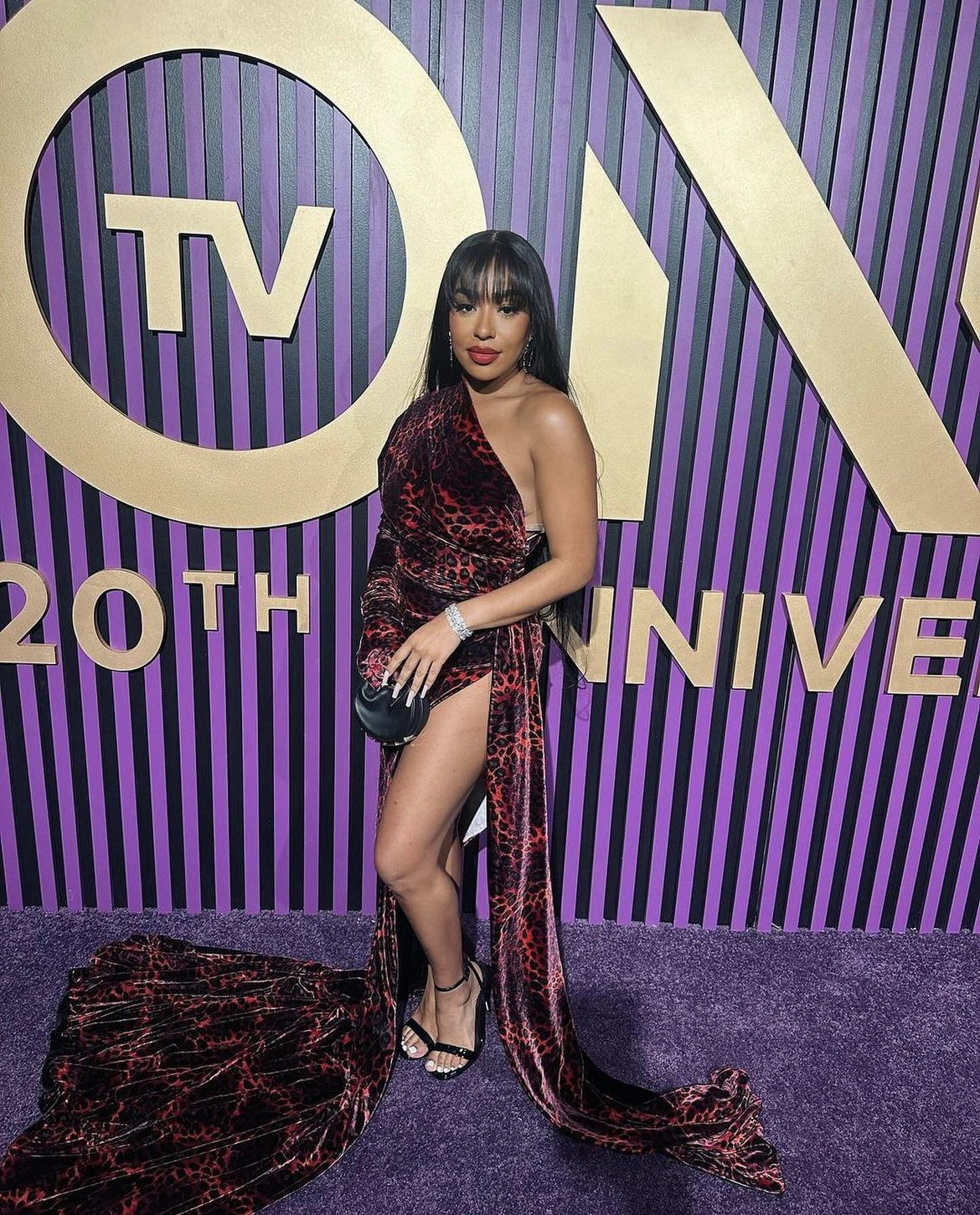 Comedian and Actress, B Simone’s gown also had a long train. The Wild ‘n Out star opted for a red custom London Couture leopard print asymmetrical gown with a high slit. We loved her red lip, china bangs, and diamond jewels which oozed with confidence.