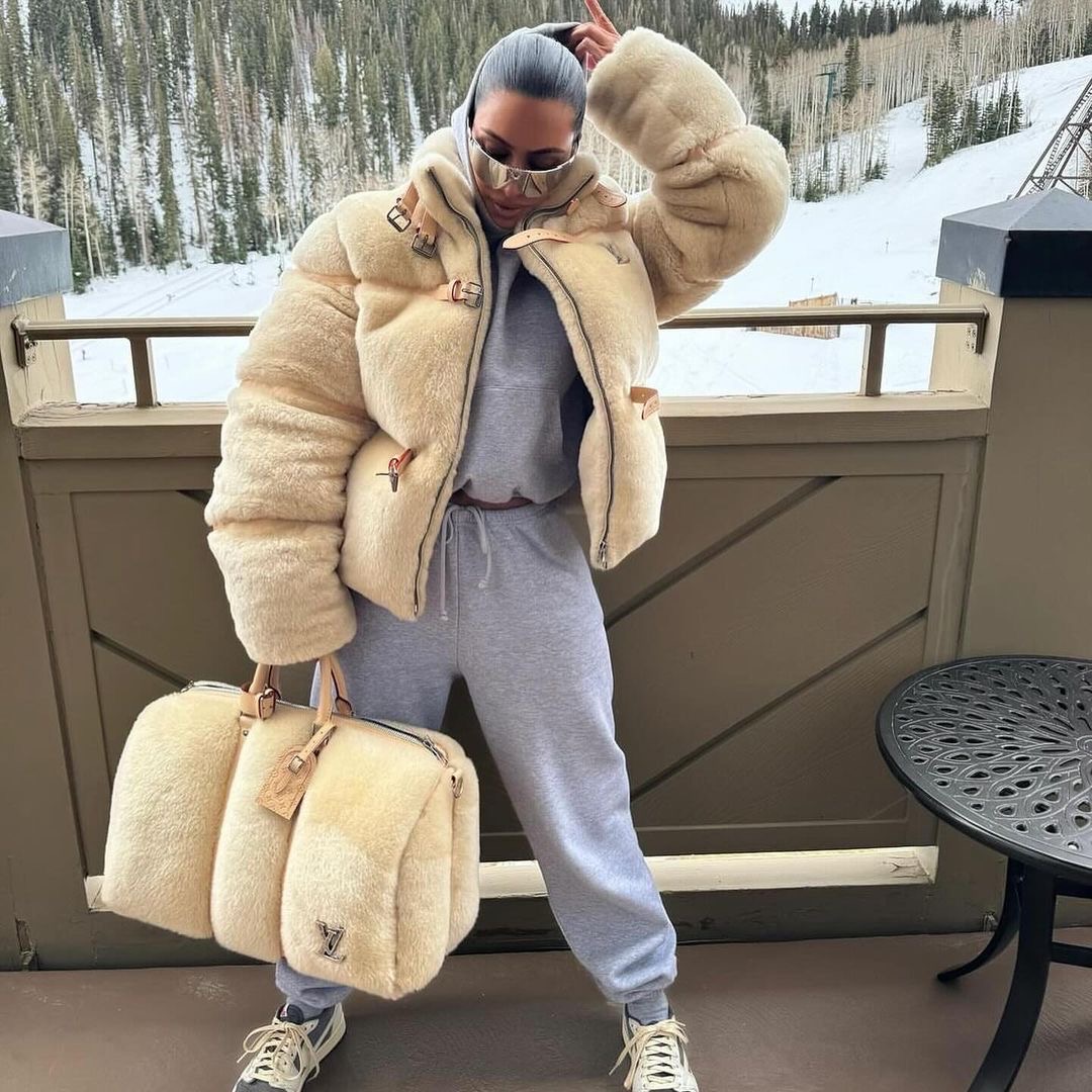 While in Utah with her children, Kim posed outside in the $22,600 Louis Vuitton set that she layered over a grey sweatsuit, and paired with color block Nike low top dunks. With her hair slicked back, and mirrored shades, Kardashian gave us sporty vibes.