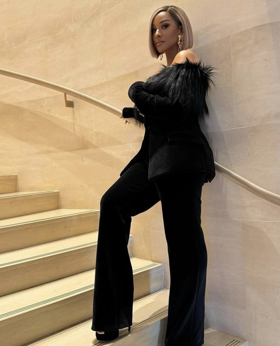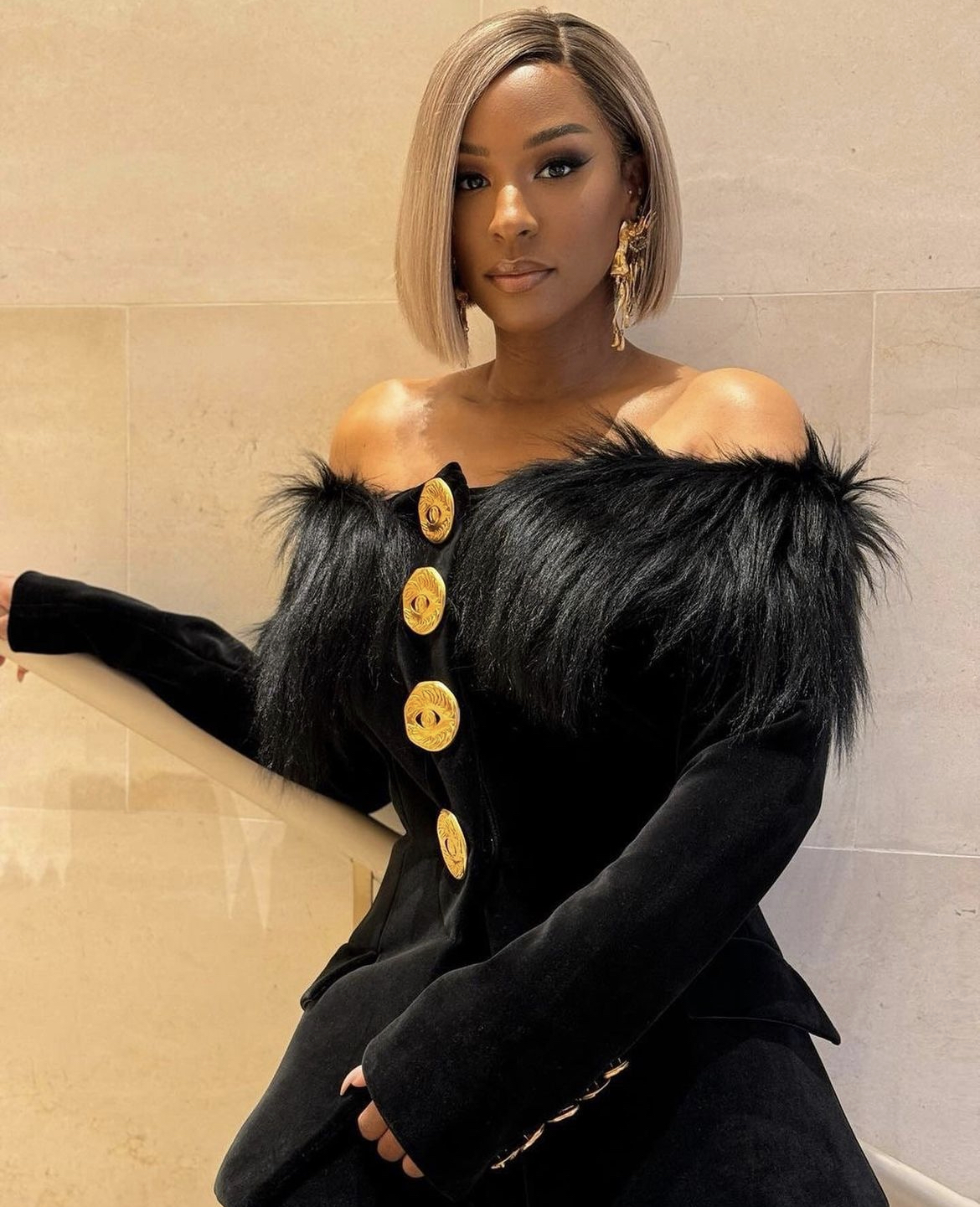 In addition to Sabrina Elba representing for the stylish wives everywhere, Savannah James also made a marvelous entrance. The Ohio native and Interior designer came with her A-game in a black velvet off the shoulder long sleeve blazer that had fur and statement gold buttons down the center.