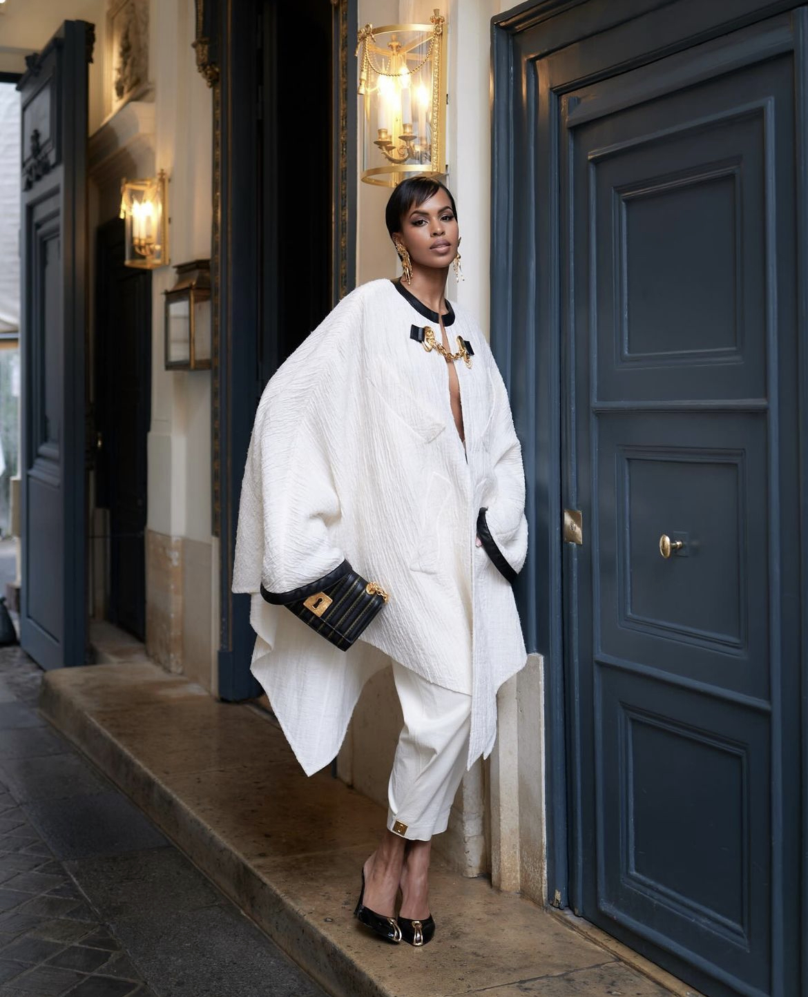 The gorgeous Sabrina Elba also opted for white in a two piece Schiaparelli set including a white kimono that had a black leather collar and gold chain detailing, that she styled with white tapered pants.