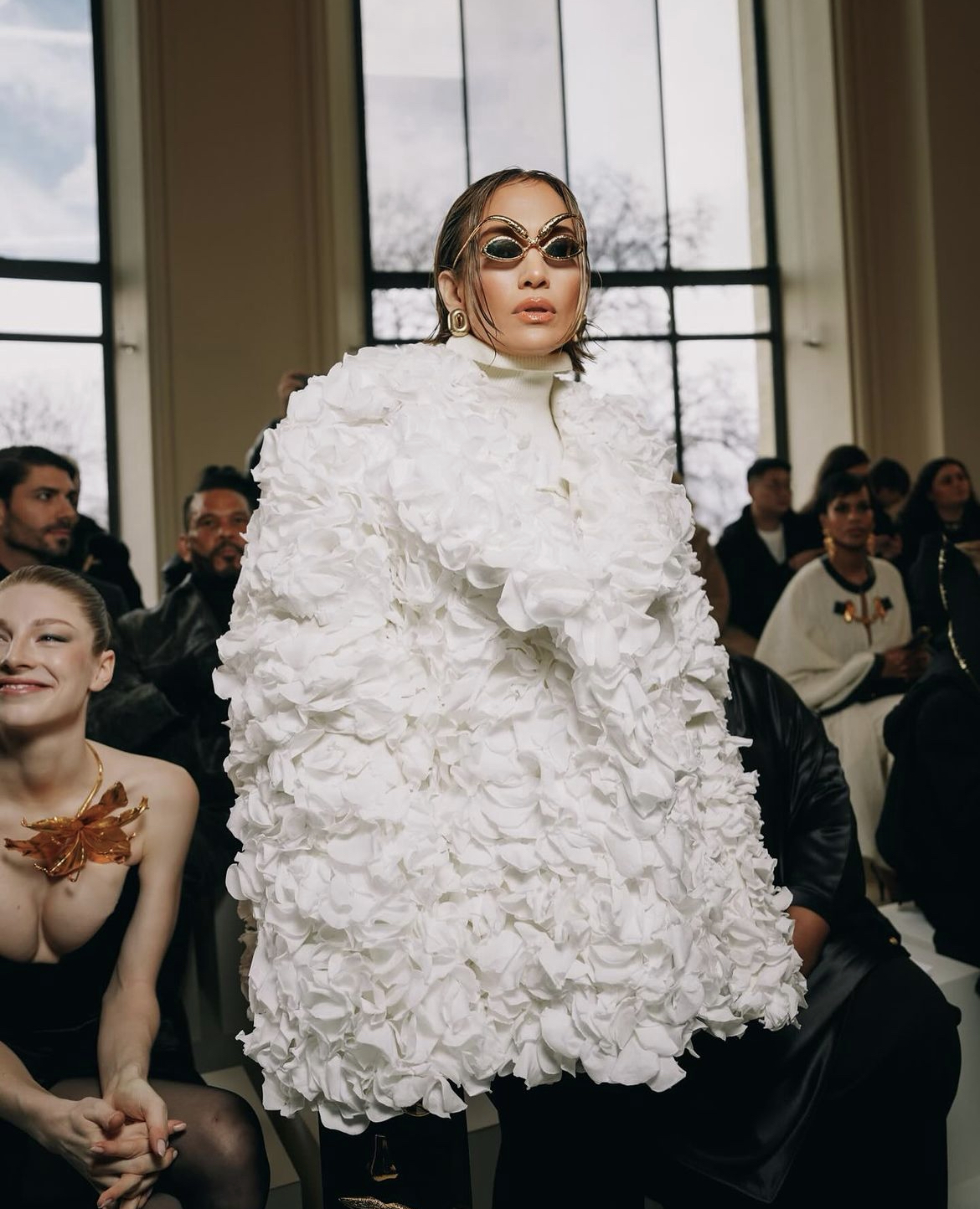JLO turned heads as she arrived to the Schiaparelli show in a spectacular white custom made rose petal coat designed by Daniel Roseberry.