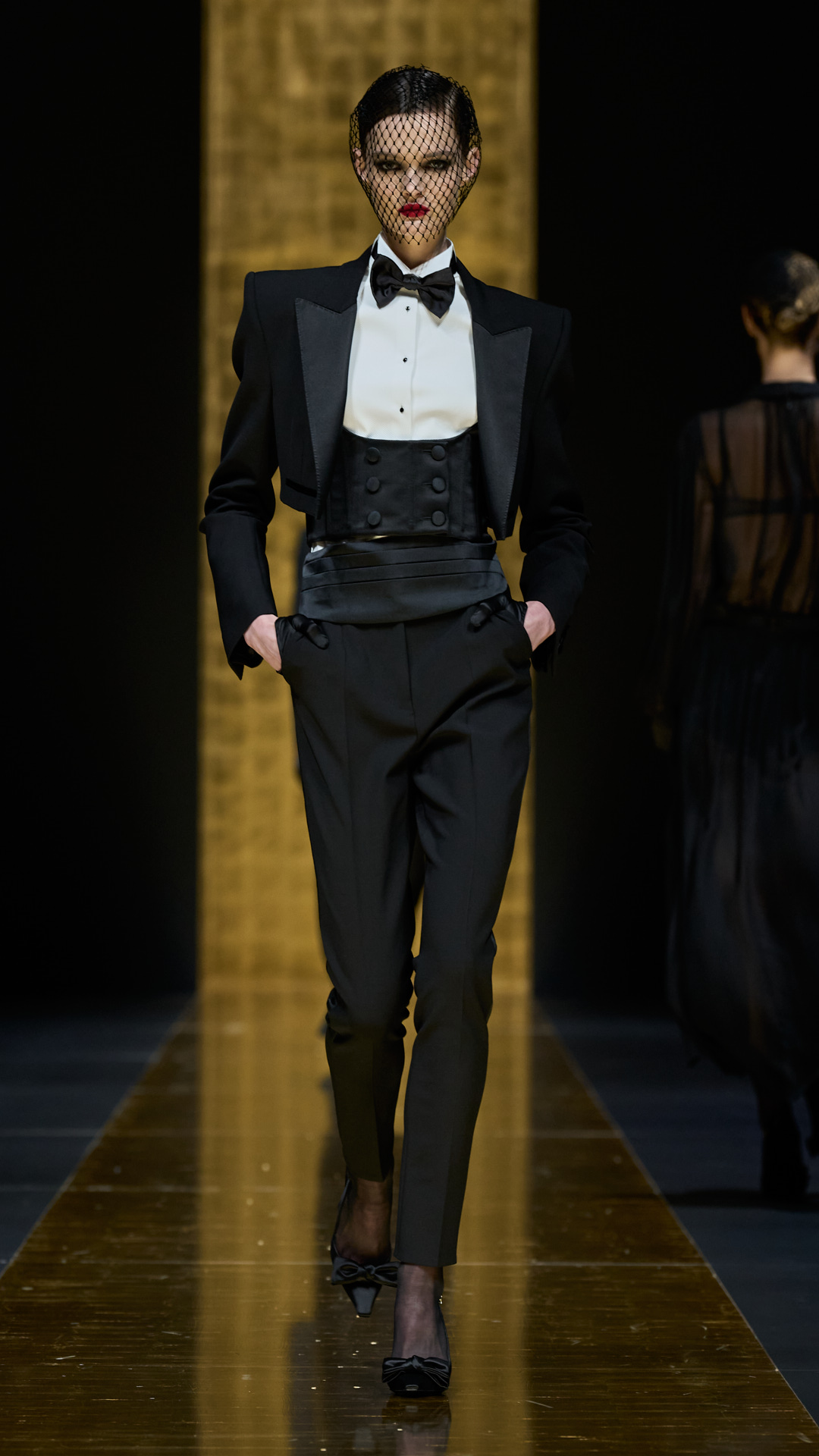 All the components of a traditional tuxedo were there, from suits with oversized lapels layered over white shirts and paired with bow ties, to crisp trousers and silk cummerbunds, perhaps many of D&G looks this season could fall under unisex.