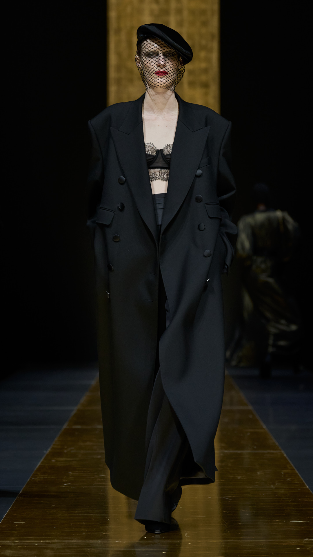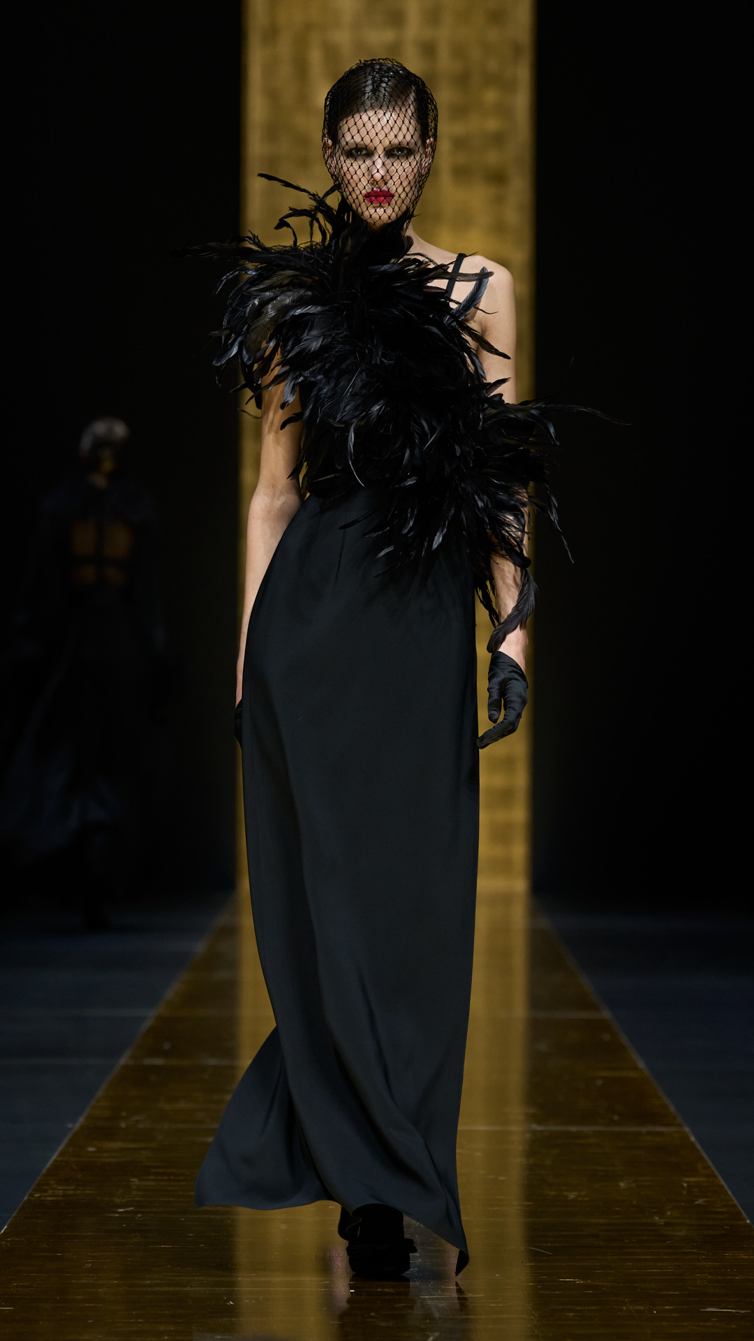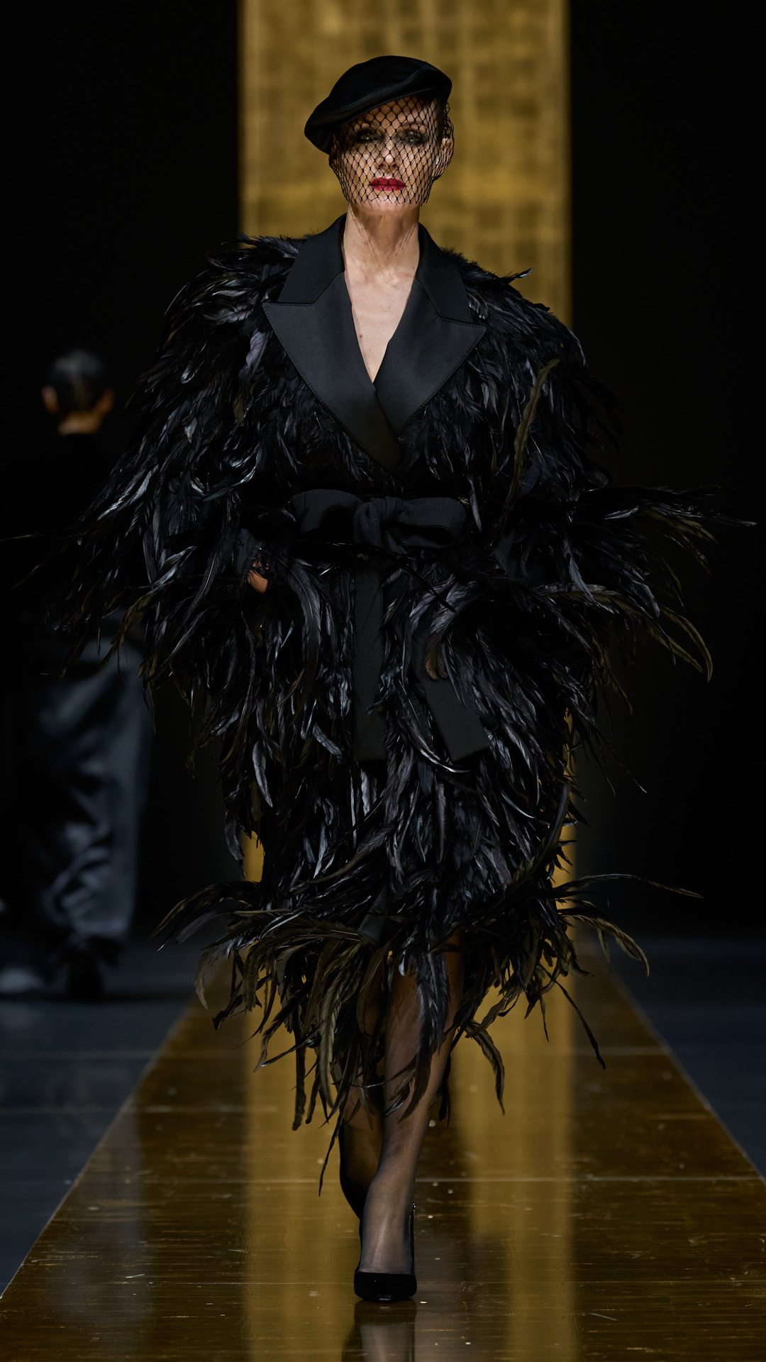 Just when we thought feathers couldn’t get any better, the brand presented a black feather trench coat with satin lapels, unlike anything we’ve seen on the runway as of late.