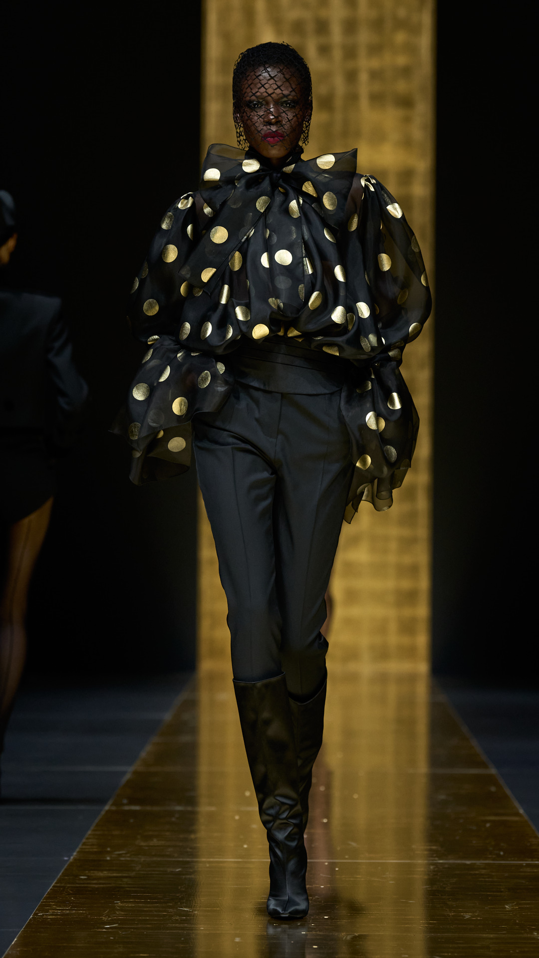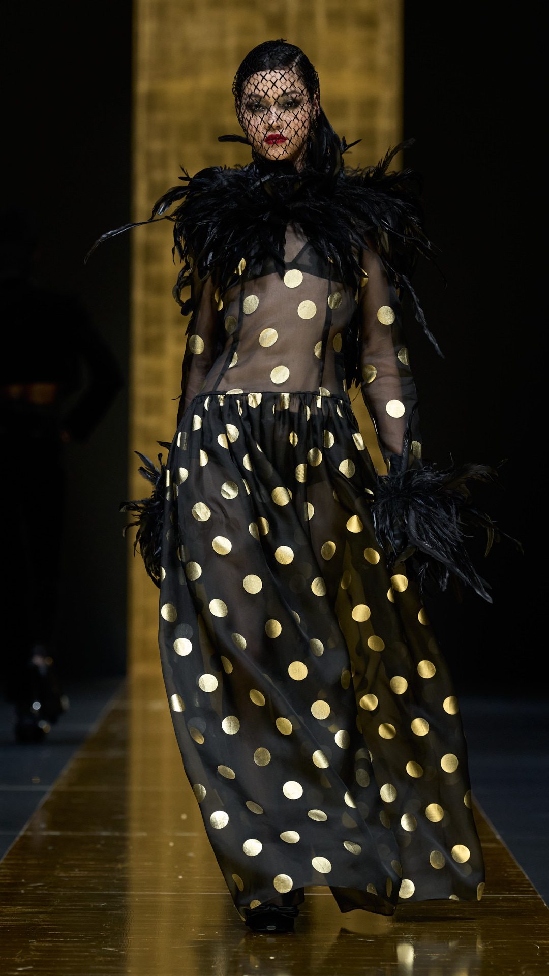 Gold polka dots also made a debut on voluminous organza blouses with oversize bows, and sheer dresses that had feather necklines, and sleeves.