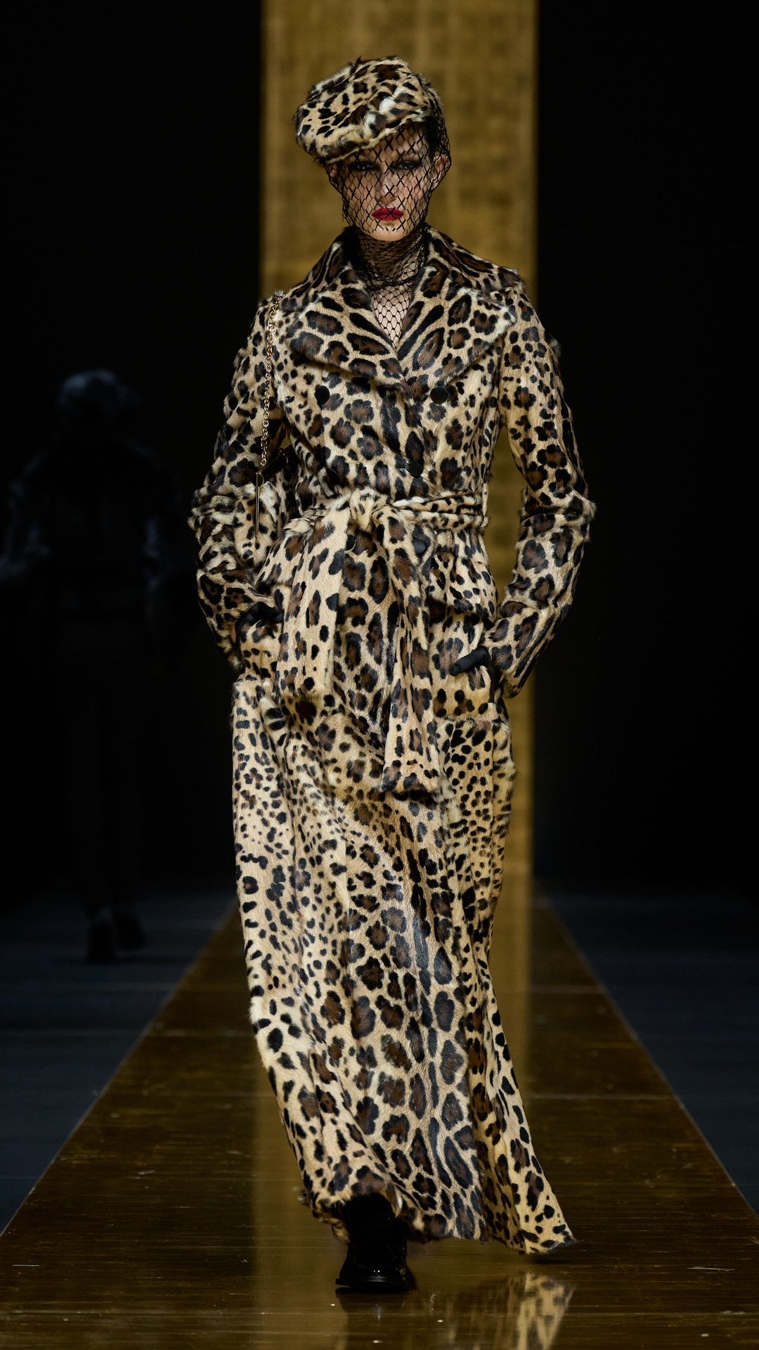 Primarily an all black collection with splashes of gold and silver, D&G also incorporated their iconic leopard print. One model slayed the scene in a fierce leopard trench coat with the matching hat that could easily be mistaken for Cruella Deville, but in the jungle.