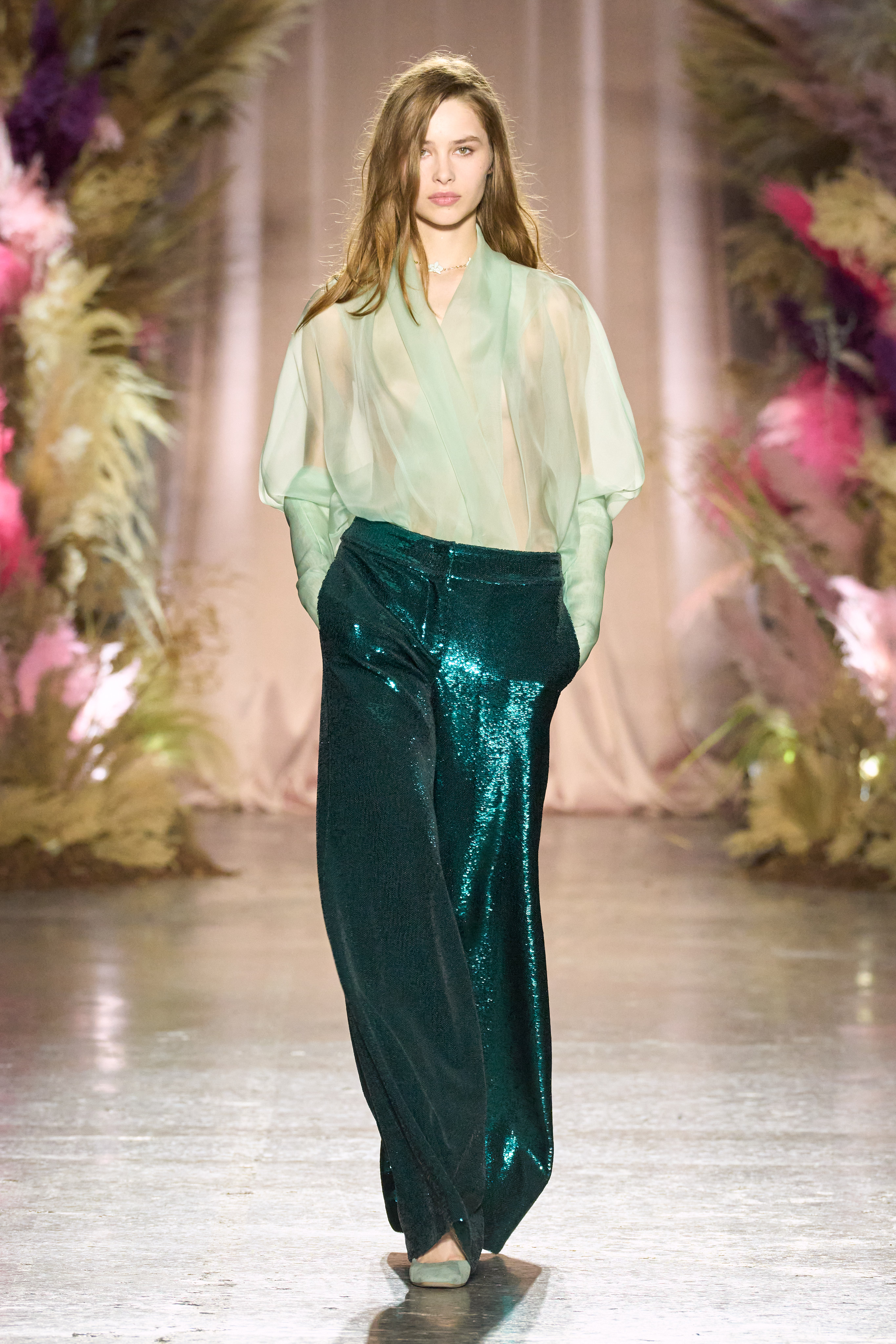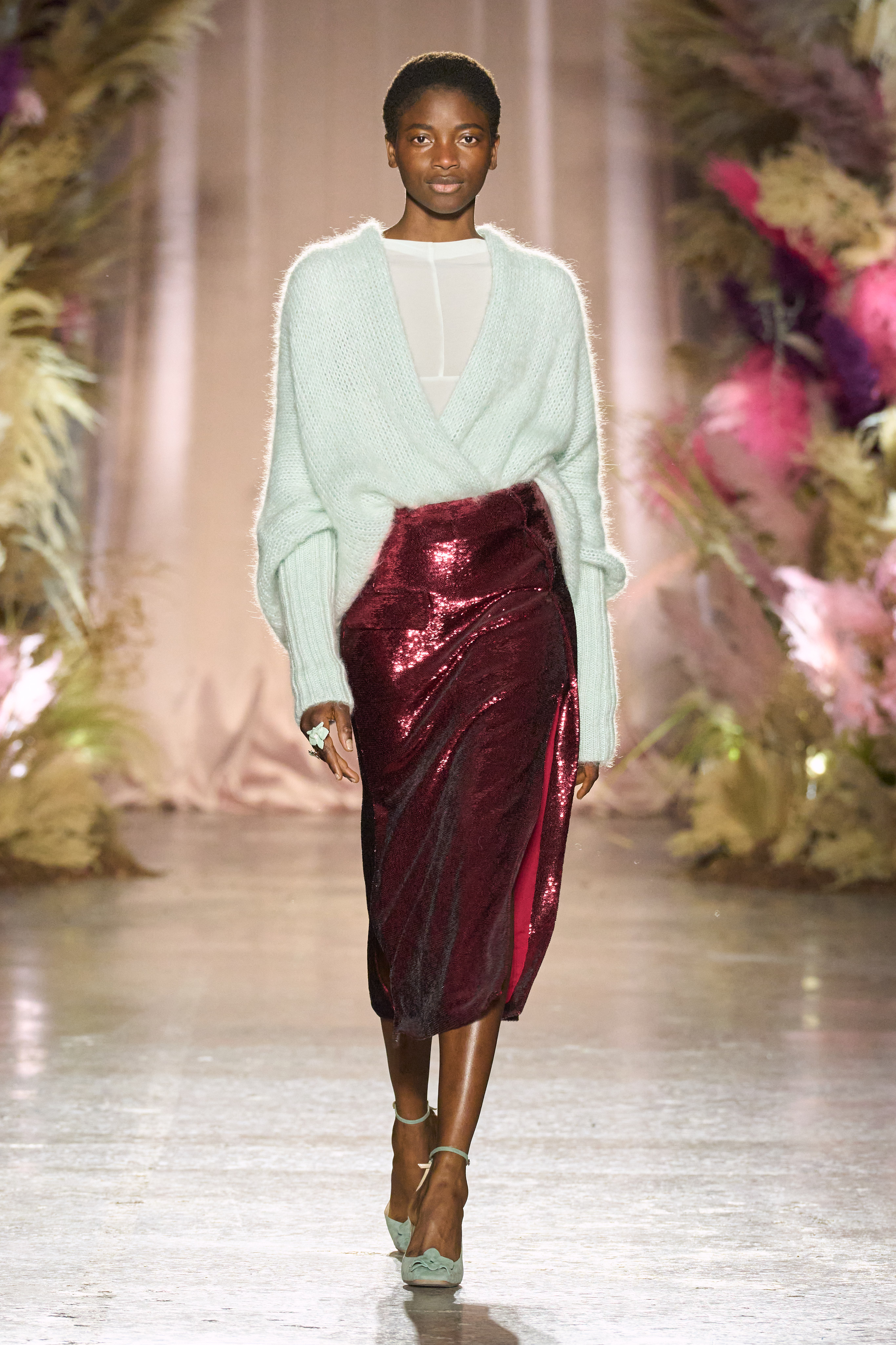 Sequins and satin showed up through trousers and dresses, organza created some of the most sensual tops and velvet was used for bell sleeves, demonstrating Facchini’s ability to design without limits.