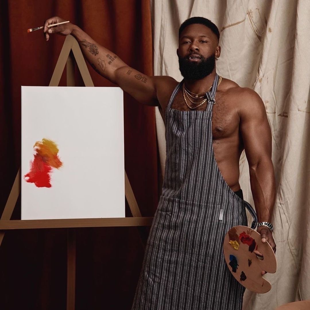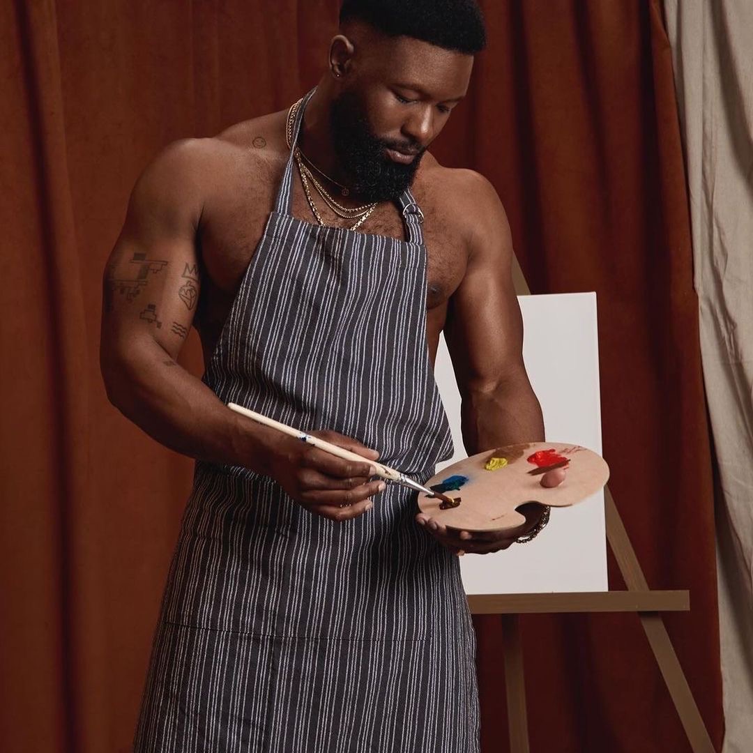 Contrary to Kelly, her co-star Trevante Rhodes (known as Zyair in the film) stayed in character and on theme as he posed practically bare in front of a easel board with an apron on .