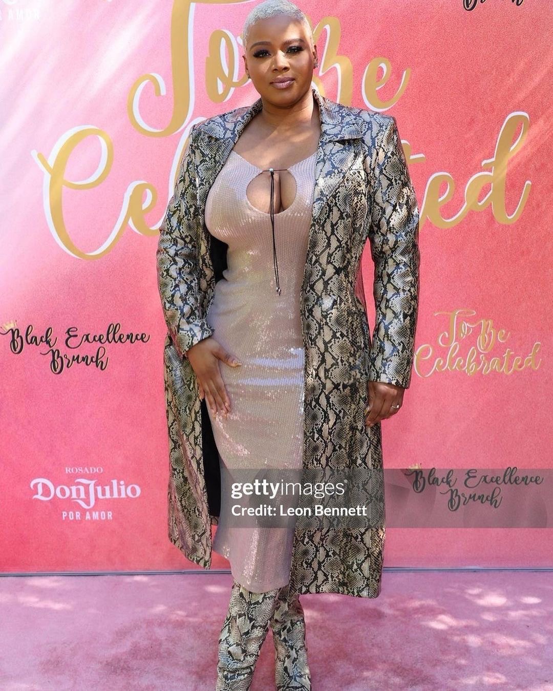 Dressed in a nude sequins ZCRAVE dress, Claire layered her look with a snakeskin leather trench coat that was complimented with the matching thigh high boots for the perfect cohesion.