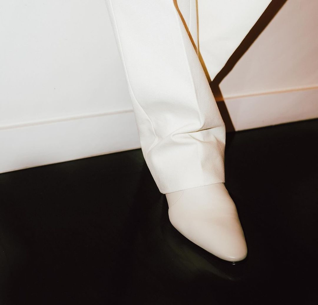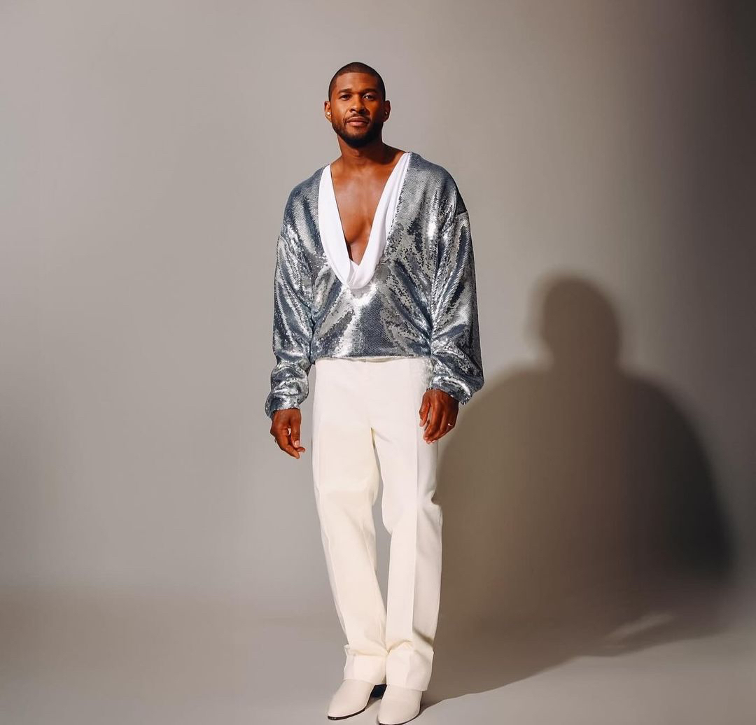 For a fresh finishing, Usher wore crisp white trousers, and white ankle boots that were characterized with an almond toe and cuban heel.