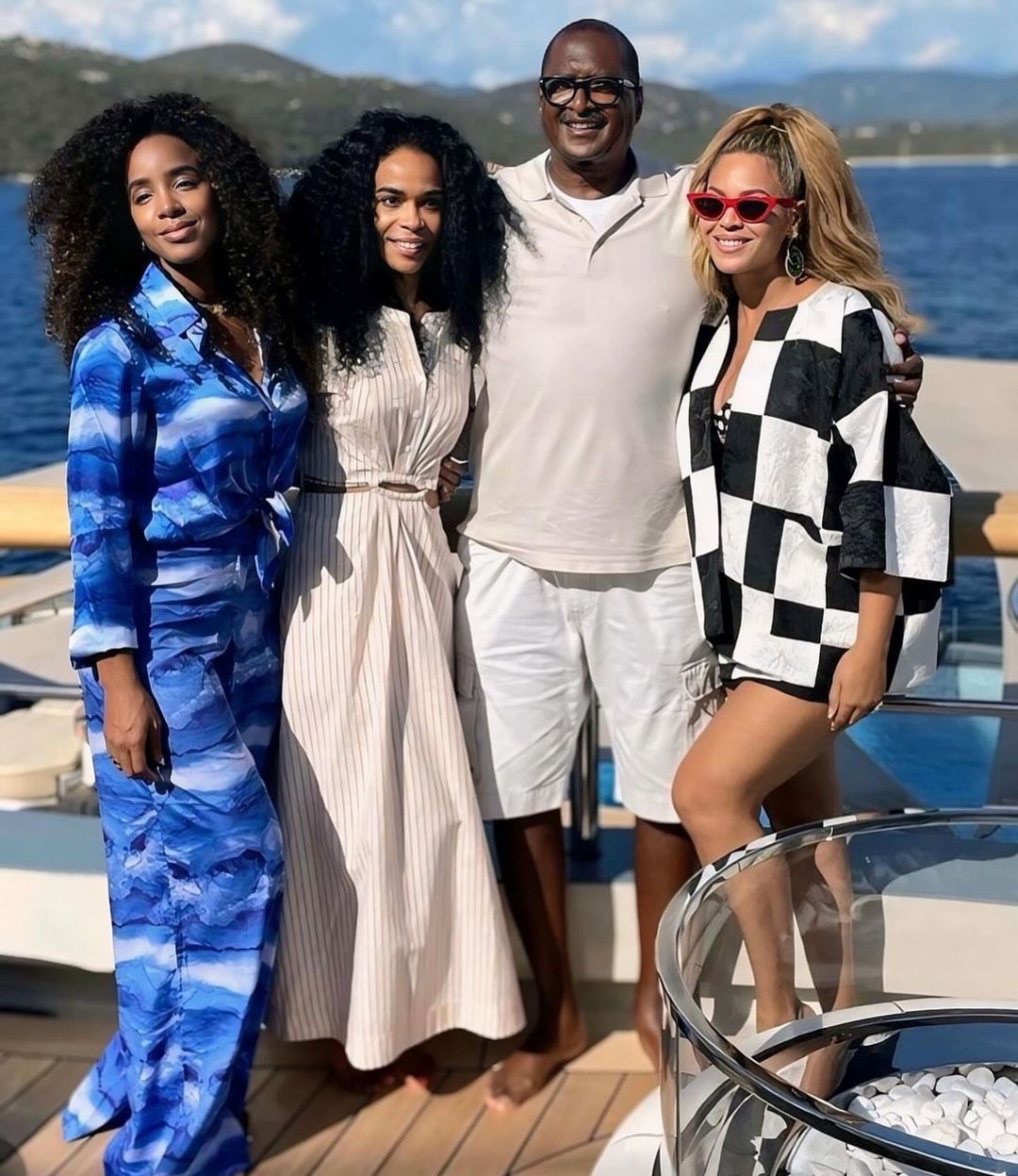 Kelly Rowland looked serene while yachting with former group members Beyonce and Michelle, and former manager Matthew Knowles, matching the waves of the ocean with her ocean printed Sai Sankoh set: