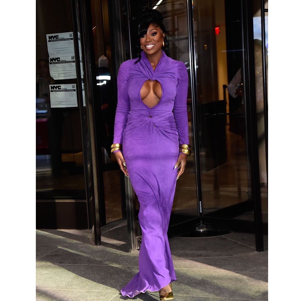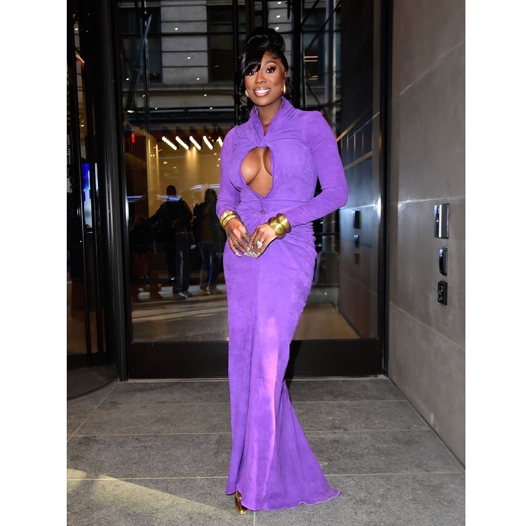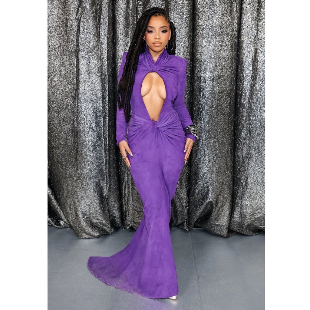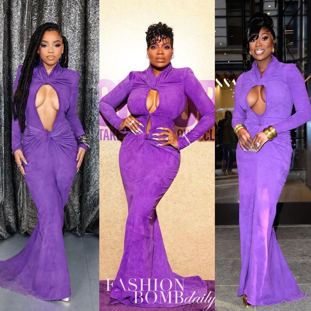 If there is one style that celebs can’t get enough of, it’s LaQuan Smith purple suede keyhole twisted gown that has been seen on Chloe Bailey, Fantasia and Real Housewives Wendy Osefo.