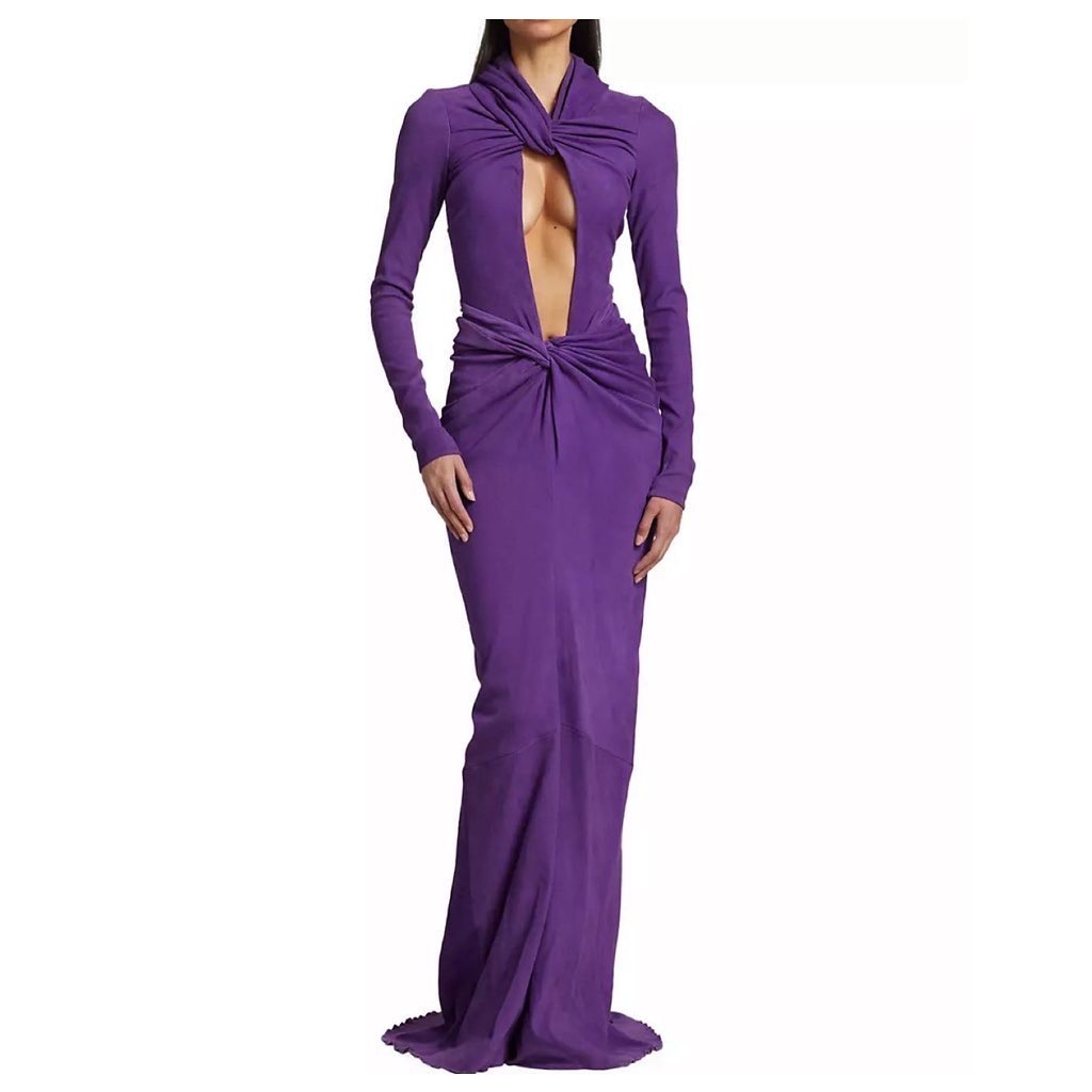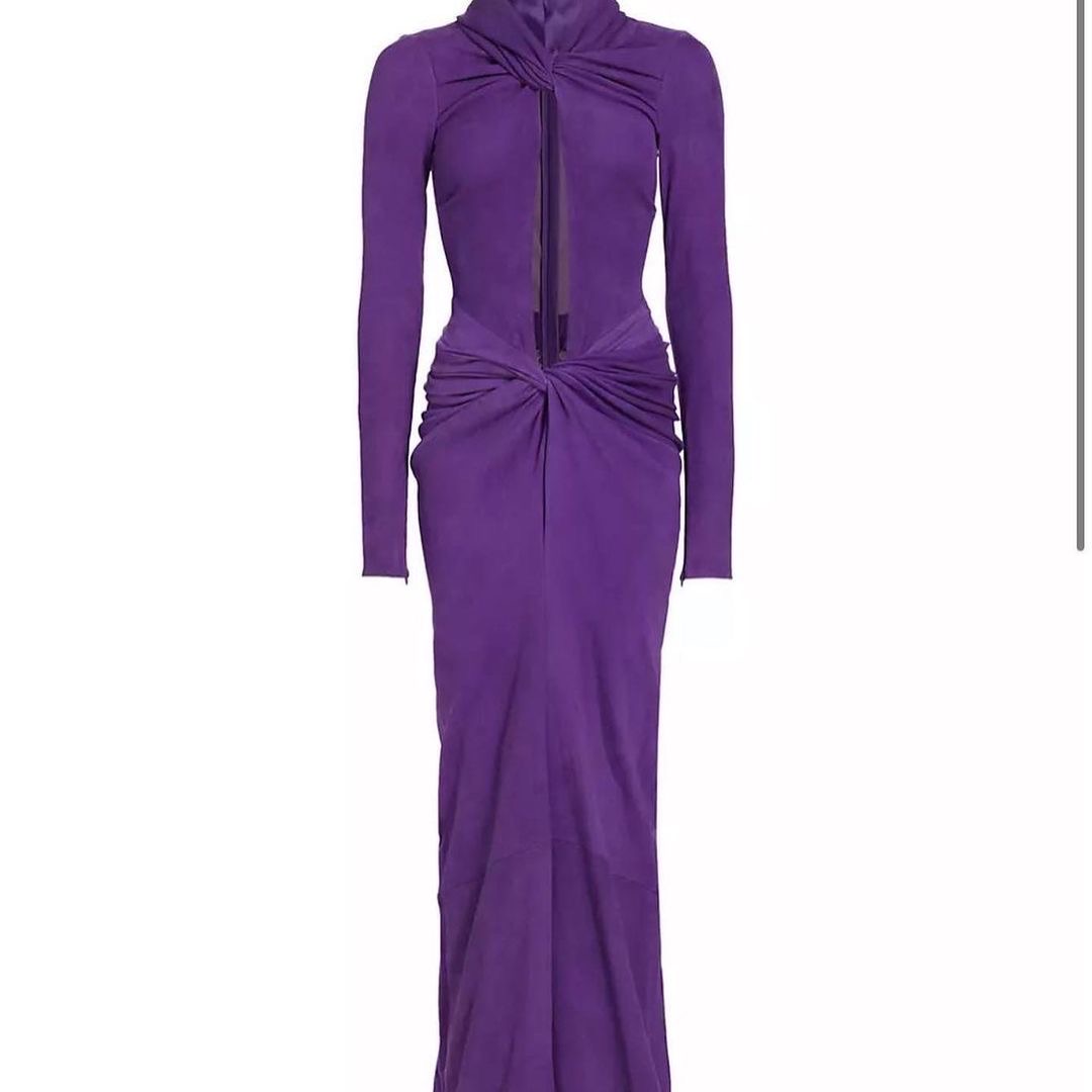 The popular gown retails for $2,395 and is crafted from a soft lamb suede, and characterized with delicate ruching and a body con silhouette.
