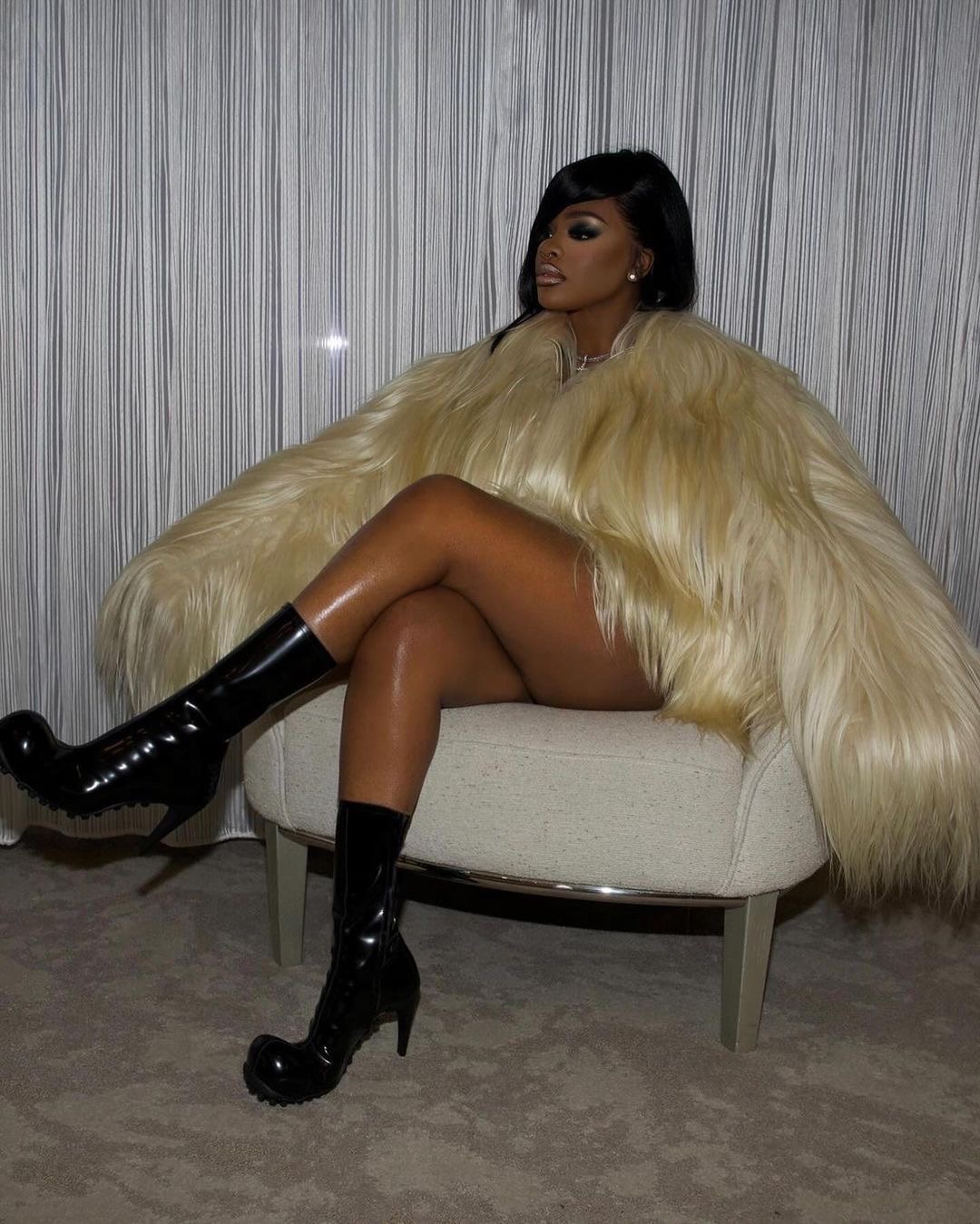 For her incredible glam, the rapper opted for a smokey eyeshadow, with contour cheekbones, and a metallic lined lip. Her updo ponytail gave us Aliyah vibes with her swoop bang that covered her right eye.