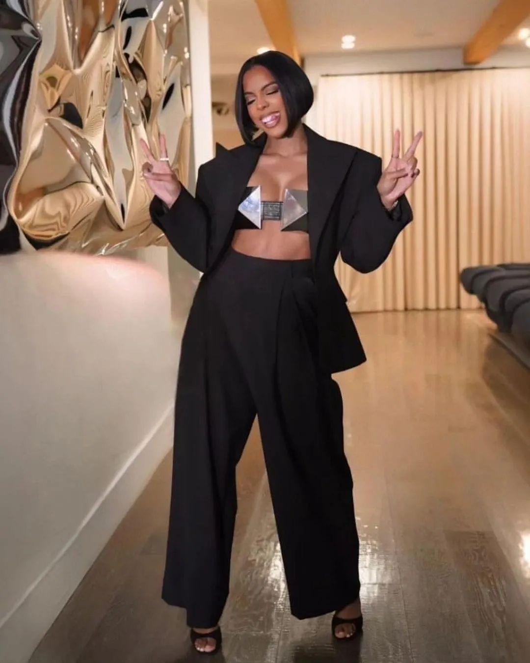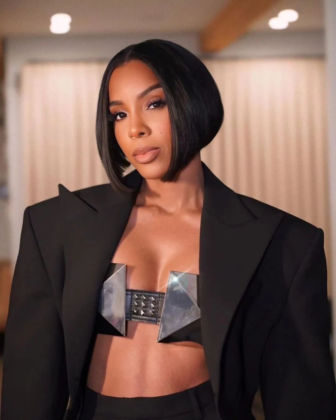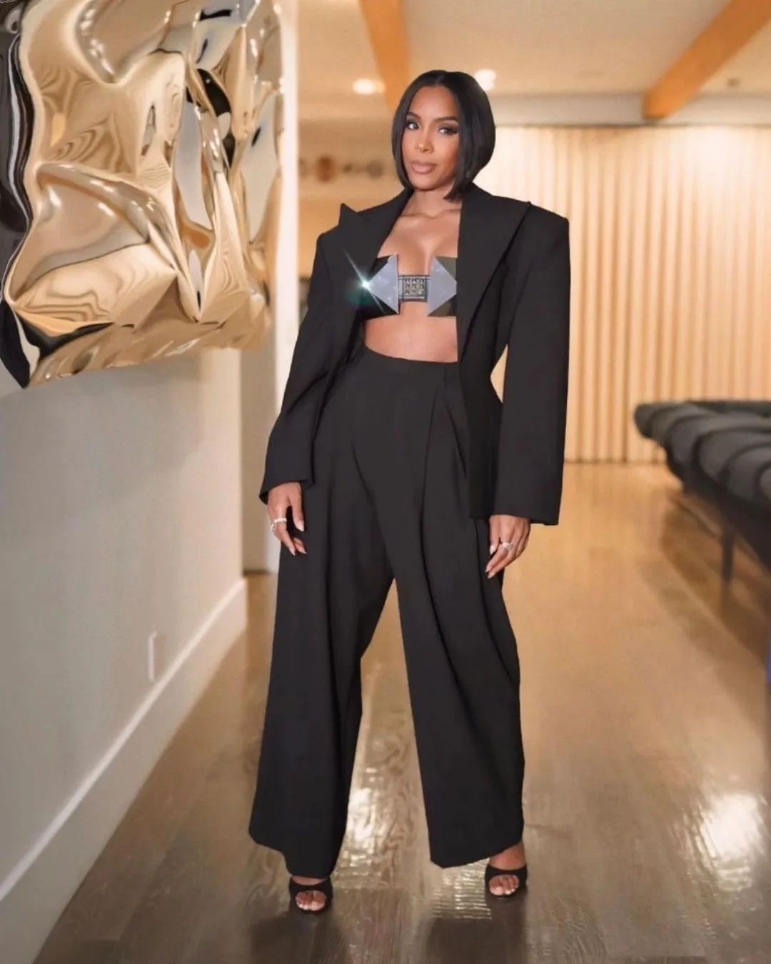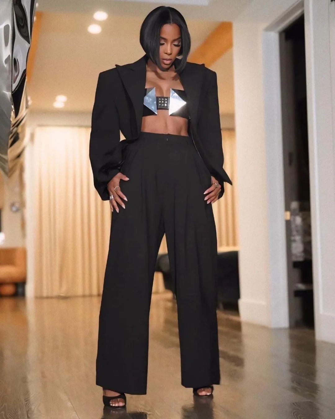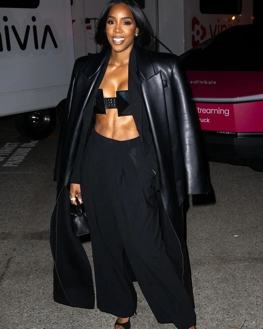 Kelly Rowland offered a modern twist on women’s suiting with her metal Ashton Michael cone bra at the Vinivia streaming app launch in Los Angeles last Thursday.
