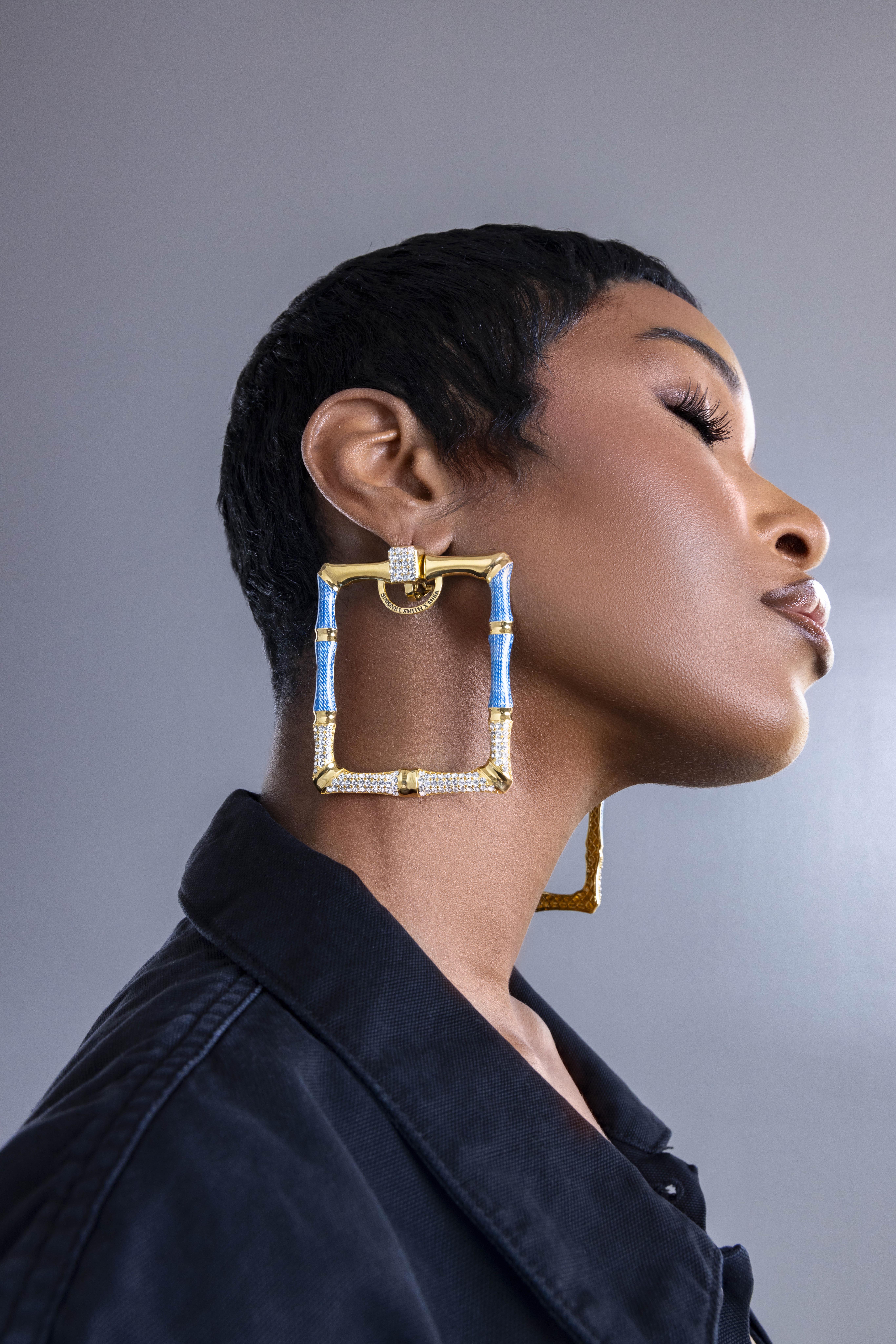 Both styles retail for $349 on Simoneismith.com and are 18K yellow gold plated. The hand-crafted denim enamel stations, adds exclusivity to these bamboo earrings.