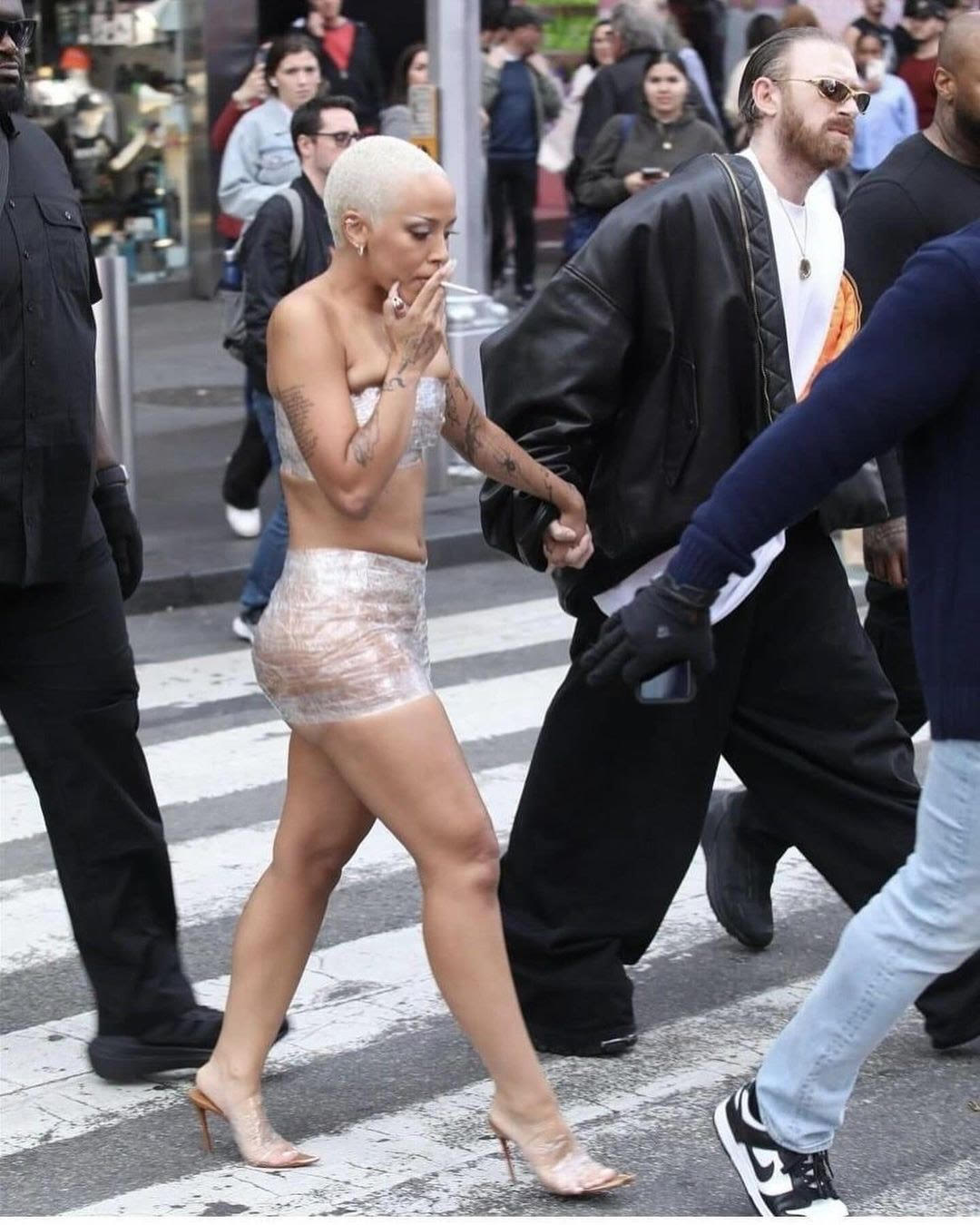 Speaking of body language, Doja Cat showed off her body in a saran wrap tube top, skirt and shoe’s that may have some of you wondering if she took a page out of Bianca Censori’s handbook.