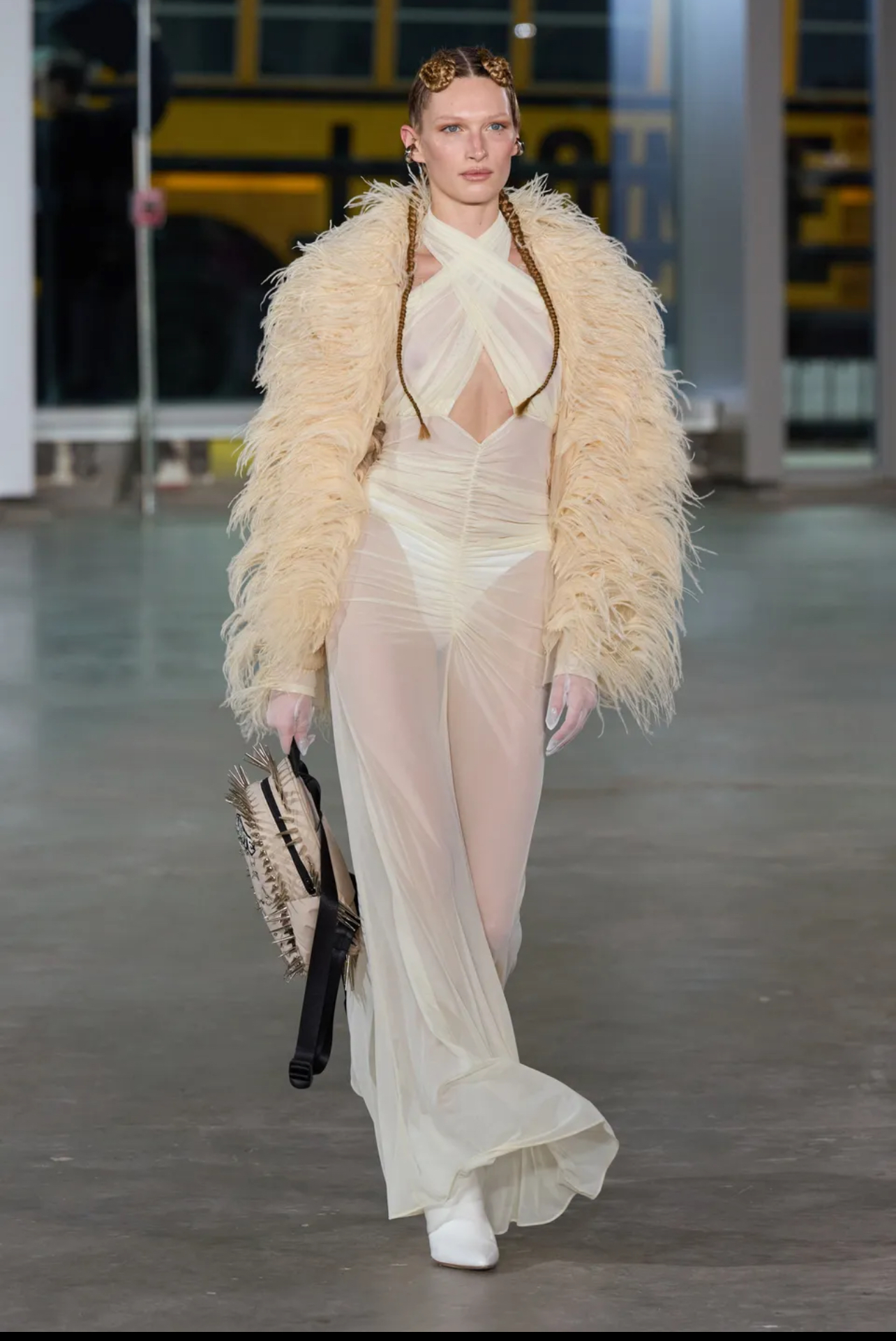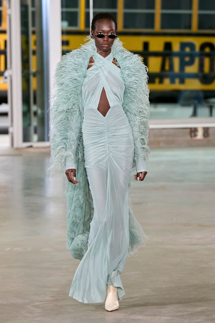 Her exact look was not modeled on the runway, but these feather adorned ensembles certainly have a similar vibe with the halter bodycon maxi dress and fur shrug: