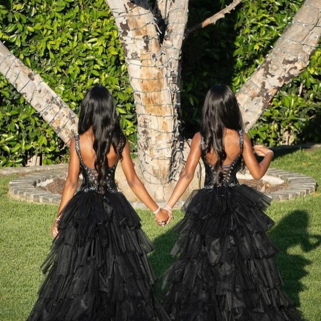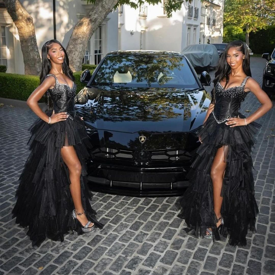 Posing in front of a Lamborghini truck, courtesy of Kimora Lee Simmons, the 17-year-olds smiled from ear to ear in matching black Kellie Ford dresses that were characterized with a pearl embellished corset bodices, and black layered tulle skirts.