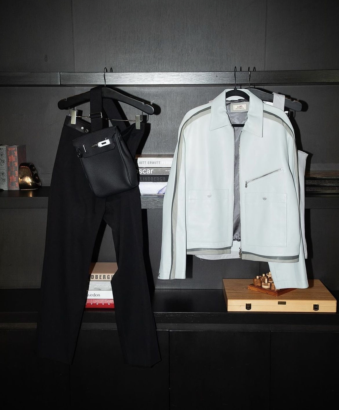 His muted teal biker jacket was layered over a matching tank, and paired with black trousers, along with a men’s Hermès backpack.