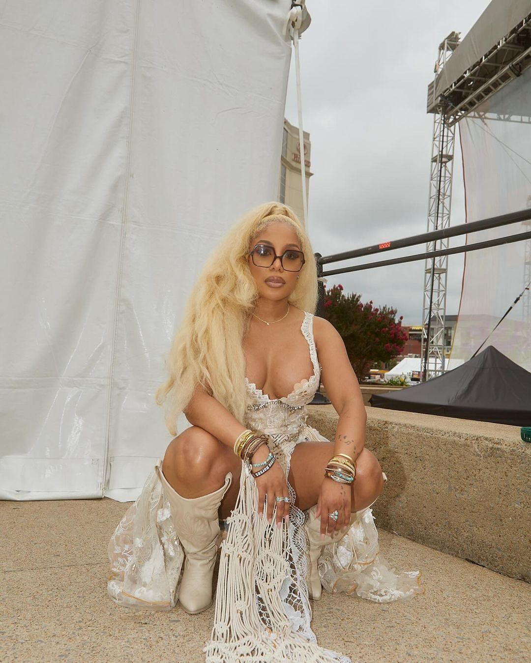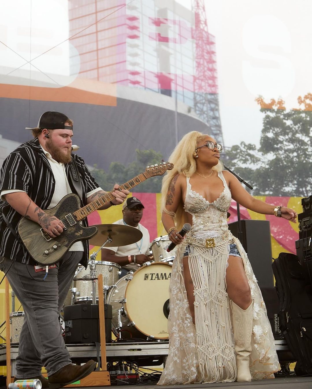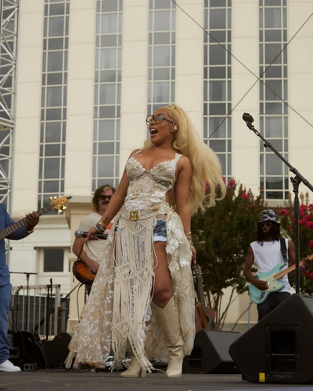 ‘Tennessee’ singer K. Michelle is still in her country music bag, and performed at the CMA fest in Nashville over the weekend in an off white Tanya Marie Handmade Goddess Gown.
