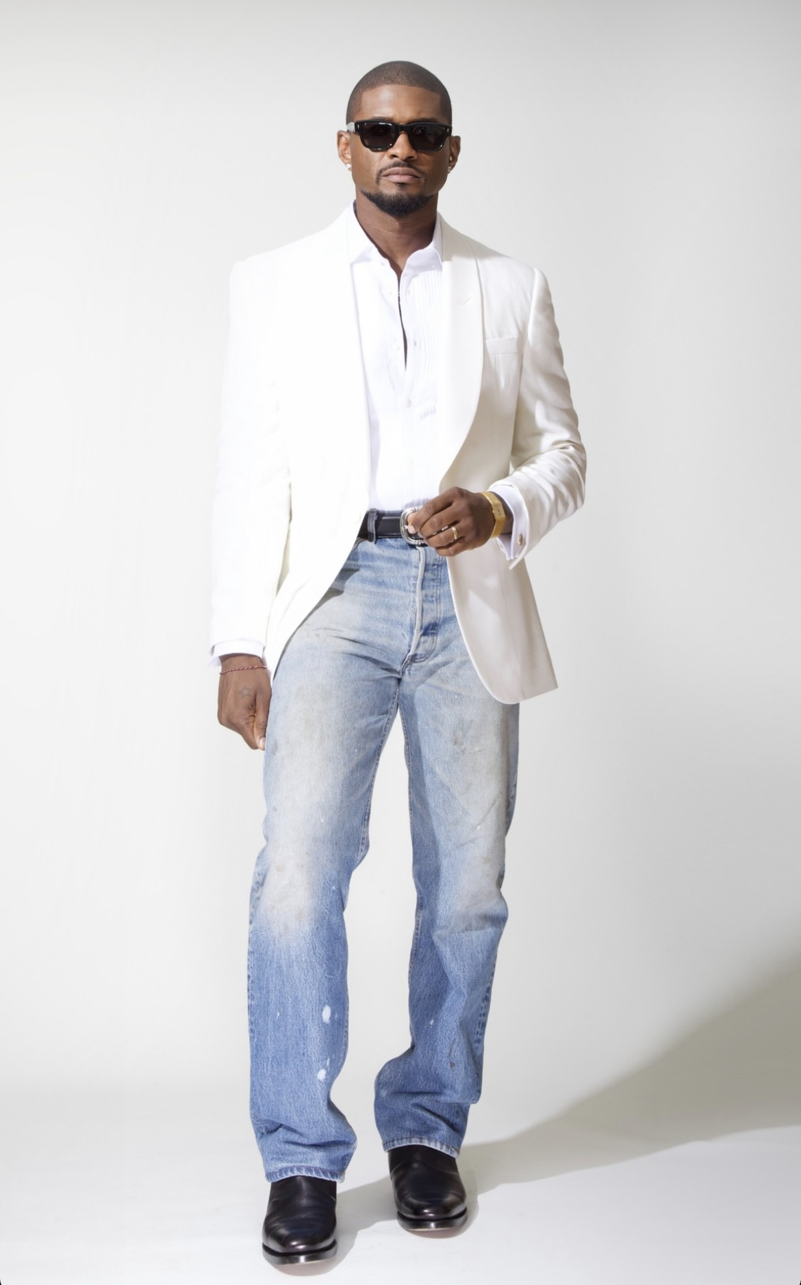 For the joyous moment, he looked like a class act in a white Ralph Lauren suit jacket that he paired with a white button up shirt, and light blue denim jeans, styled by Jeremy Haynes.