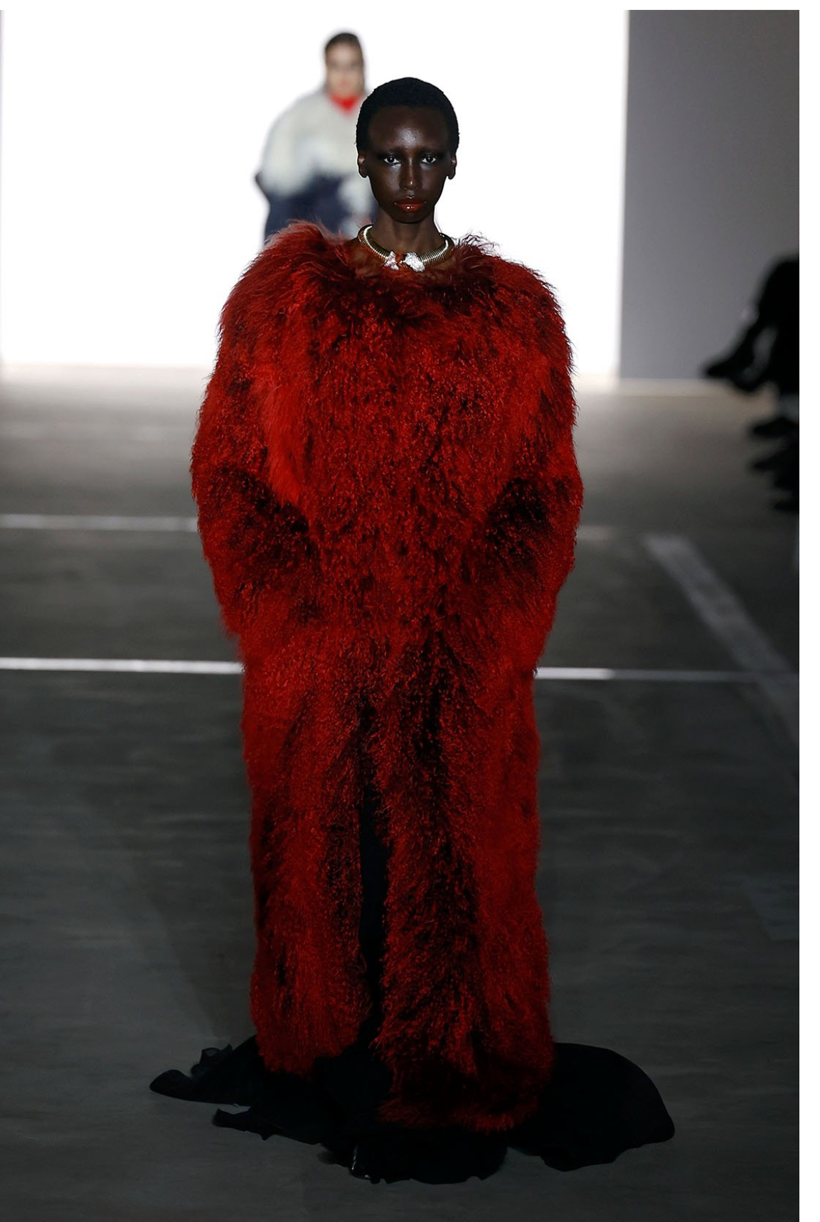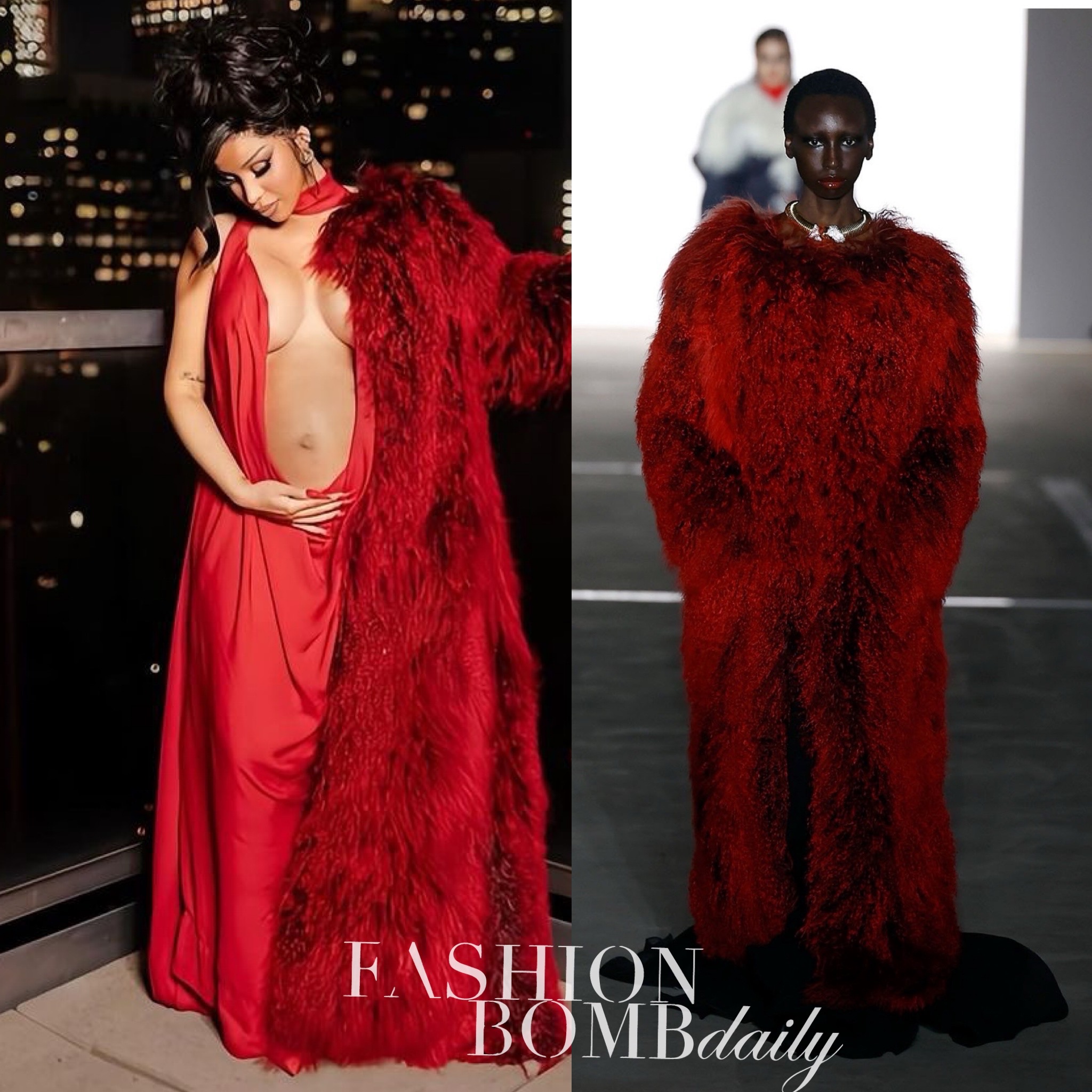 She made the announcement wearing a Fall 2024 Prabal Gurung look, comprised of a red gown and a matching fur coat: