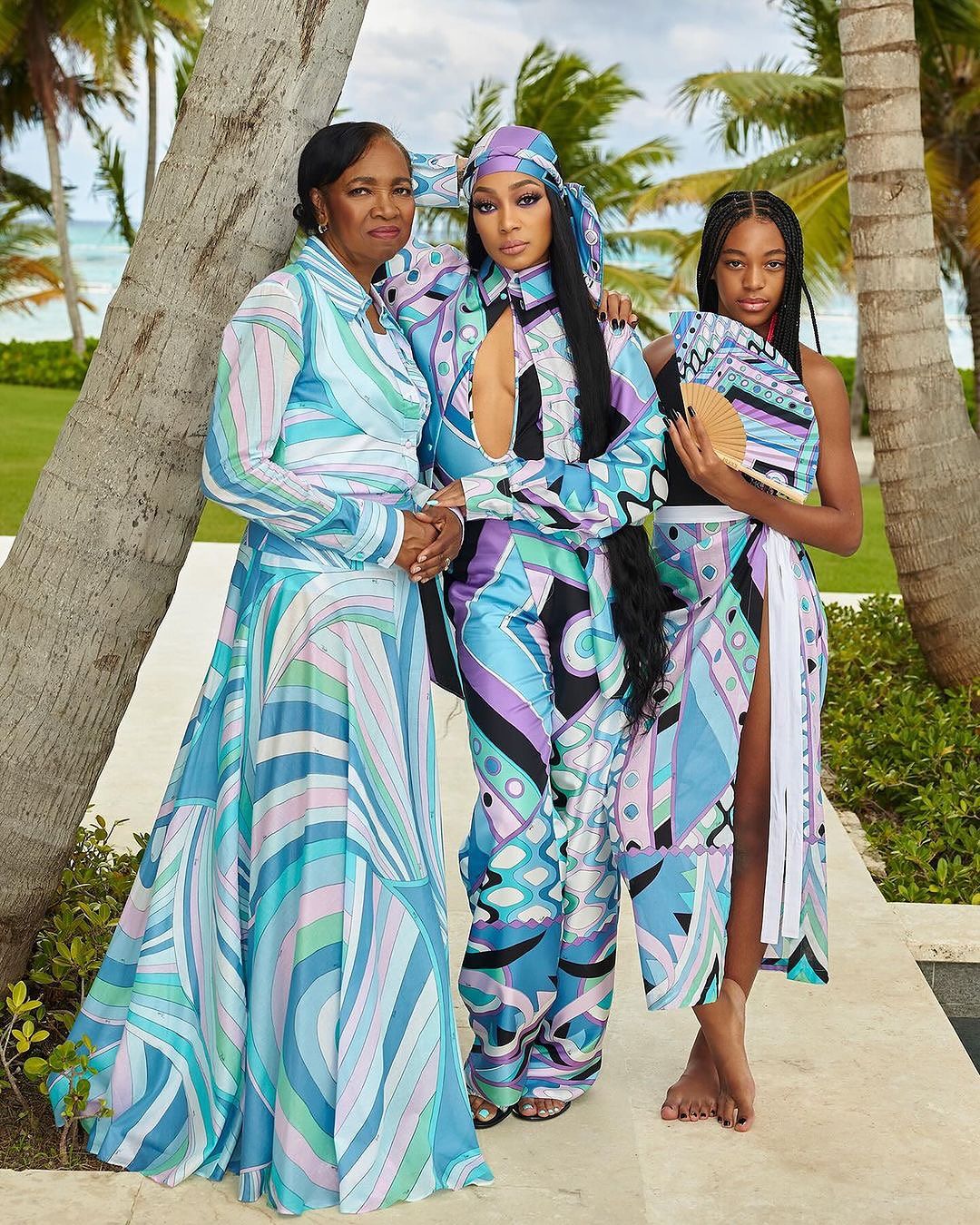 Most notably were striking Pucci ensembles worn by Monica, her mother, and daughter Laiyah. The abstract motif that each of them wore is known as Pucci’s “Vivara” print and is one of 500 patterns in Pucci’s extensive archives.