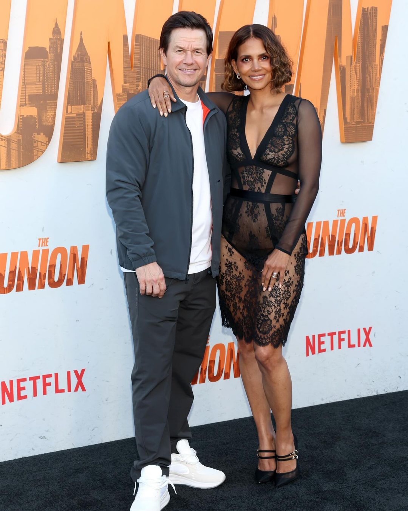 Halle Berry posed with costar Mark Wahlberg at the Premiere of the Union in LA, wearing a La Perla 2016 Dress, styled by Lindsay Flores: